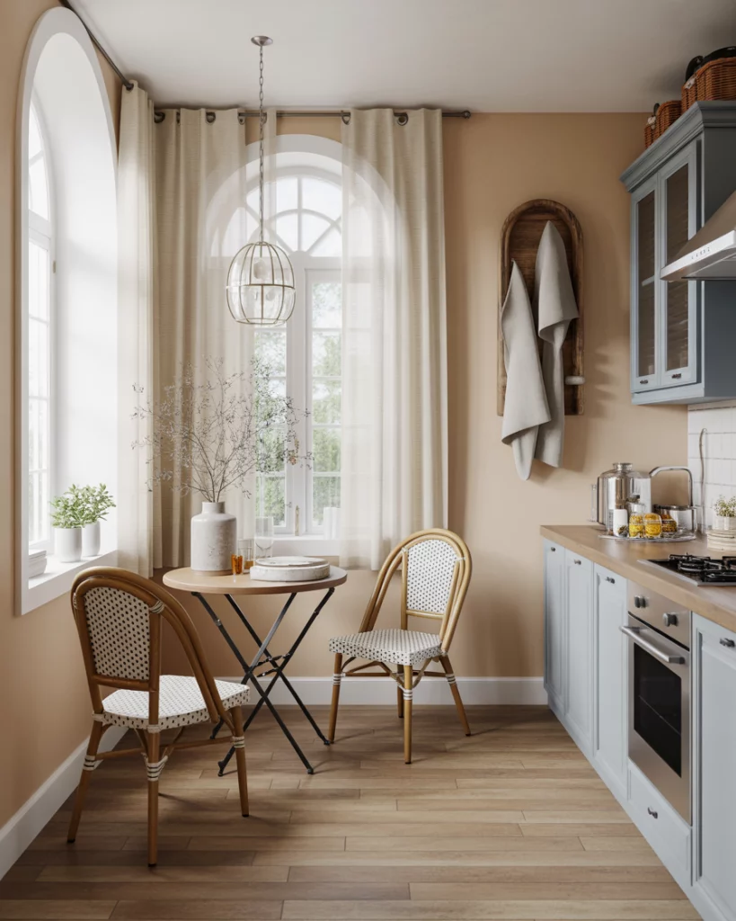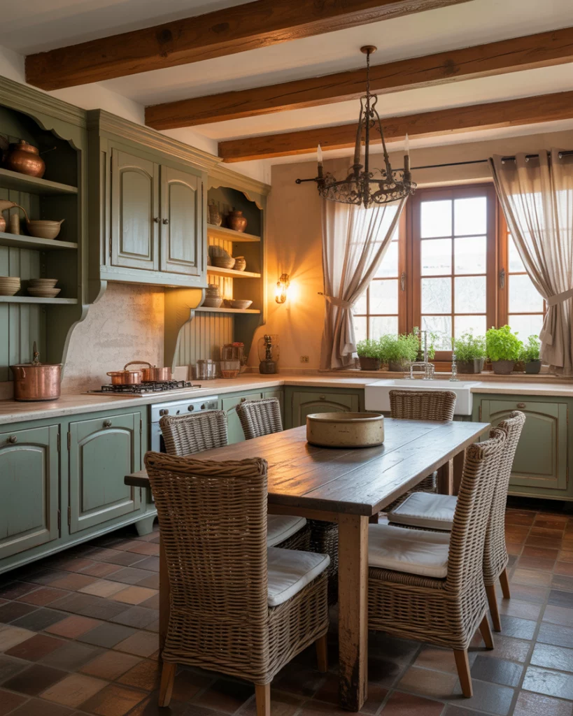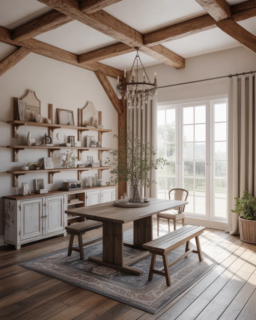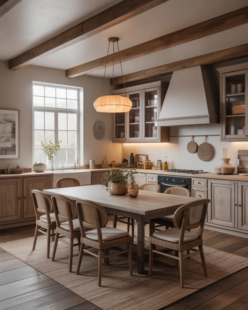 2026 brings a renewed interest in kitchen farmhouse-style dining rooms, especially for open-concept homes. Mixing traditional French cabinetry with modern appliances keeps the space practical while maintaining character. A friend remodeled her kitchen this way, and guests always comment on how welcoming it feels. Add woven chairs, iron lighting, and mismatched ceramics for authenticity.