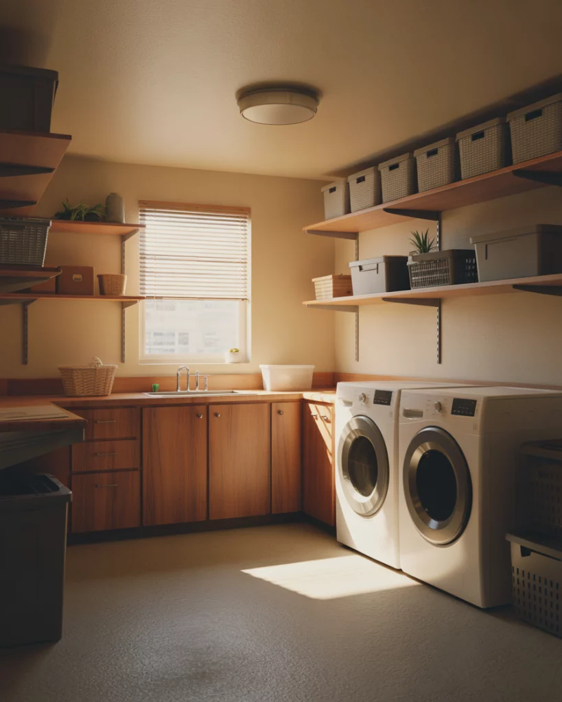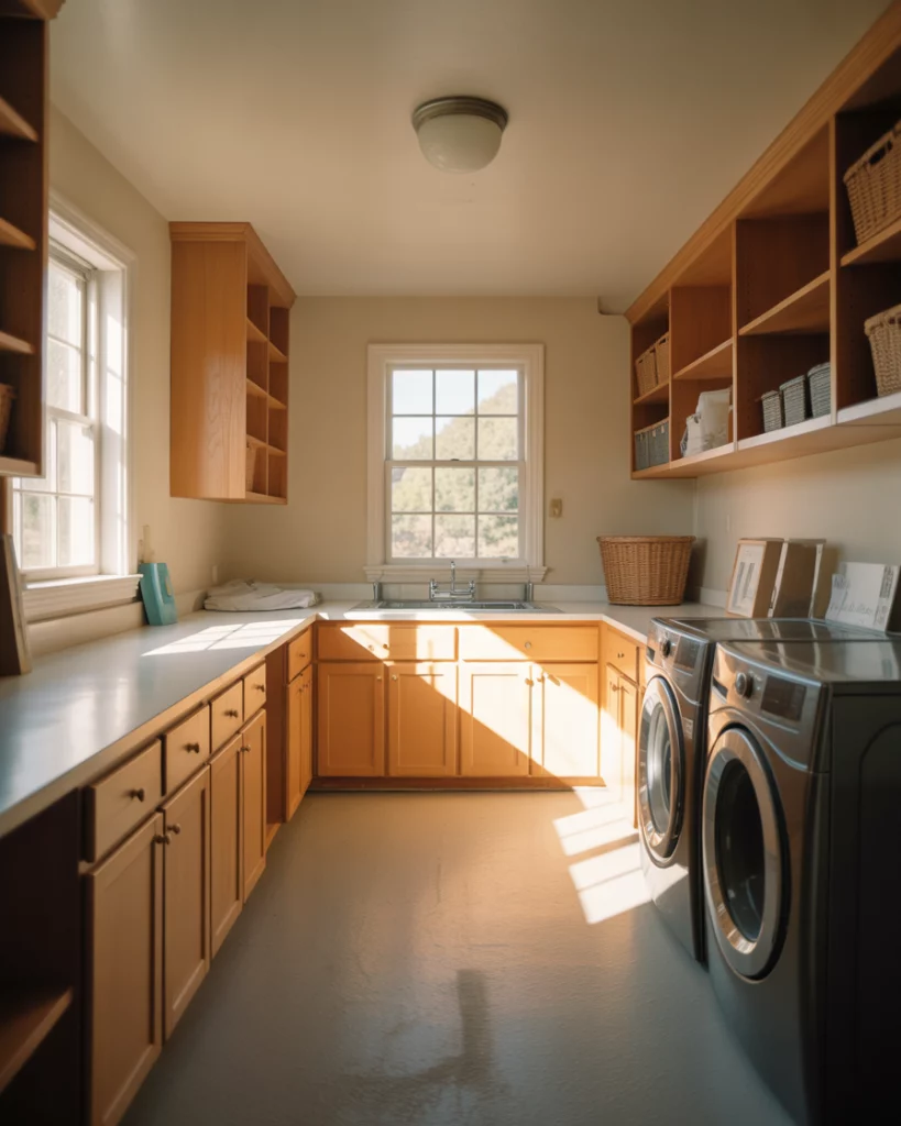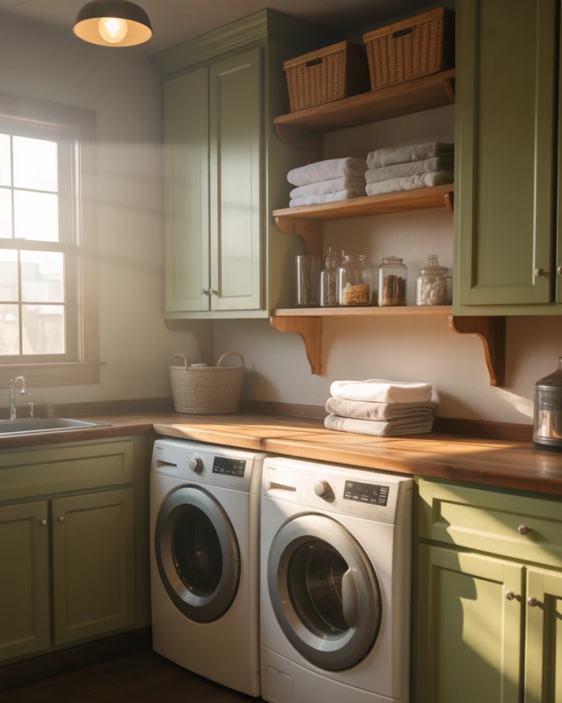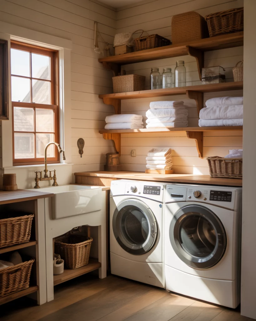 The rustic and farmhouse look remains strong in 2026, especially in laundry rooms. Natural wood, vintage-inspired hardware, and simple open shelving bring warmth to a space often dominated by machines. Micro anecdotes from homeowners often mention how these rooms feel calmer and less utilitarian. Many describe enjoying laundry more when the space feels connected to the home’s overall character.