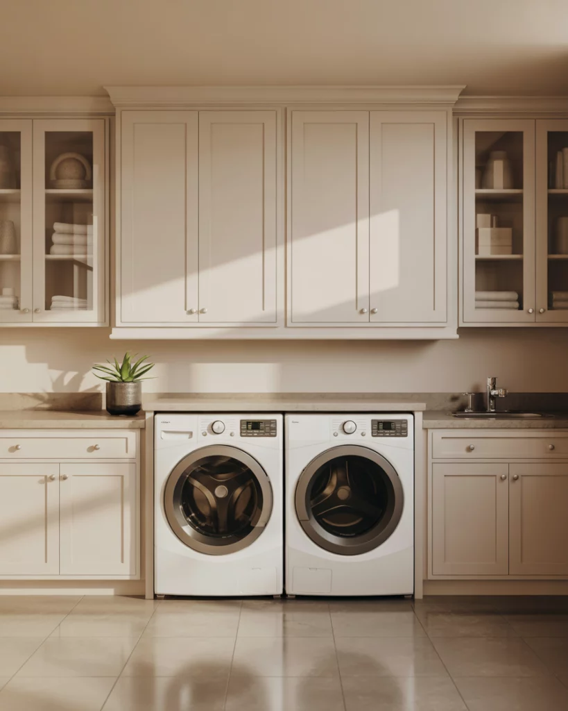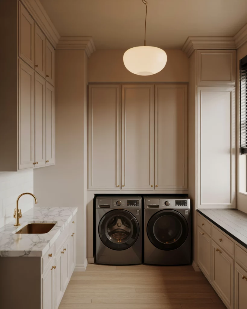 A luxury laundry room in 2026 borrows cues from spas and dressing rooms. Think stone counters, custom cabinetry, integrated sinks, and statement lighting. These rooms often feature a front loader setup that allows for seamless counters and uninterrupted sightlines. Expert-style commentary points out that luxury laundry rooms succeed when beauty doesn’t block workflow. Designers emphasize clear zones for washing, folding, and storage so the space feels indulgent without becoming inefficient.