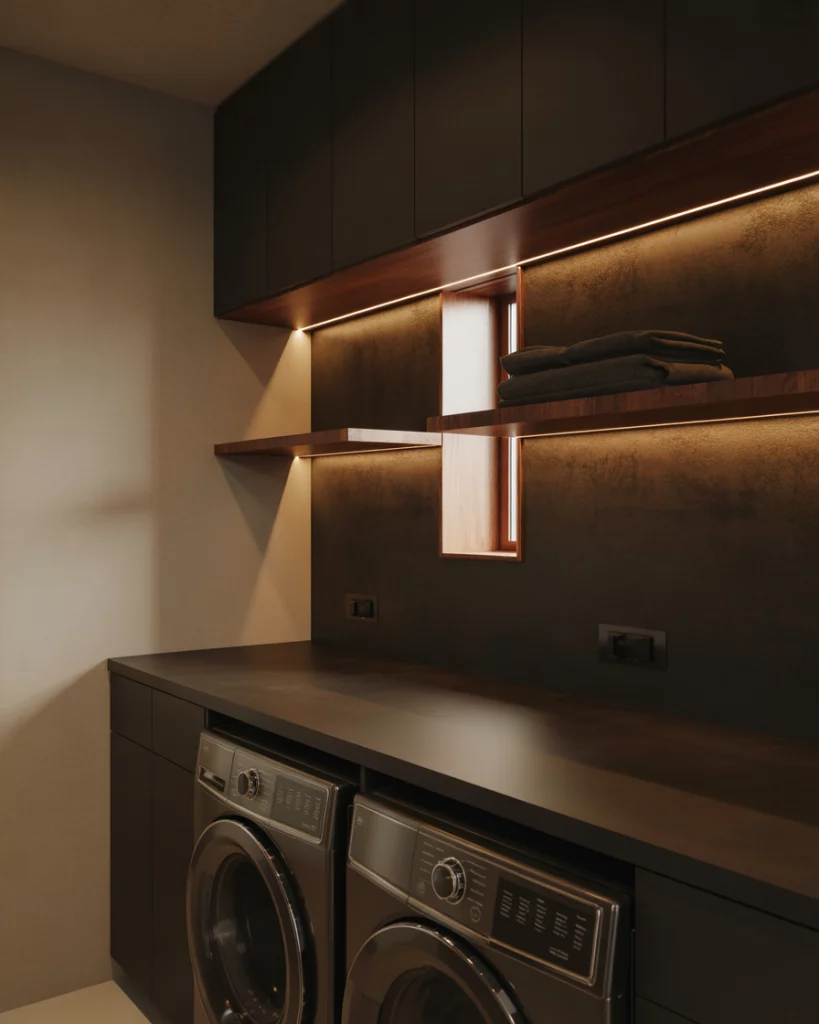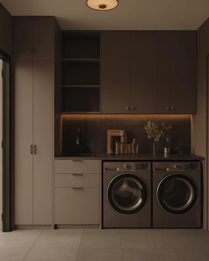A dark color palette paired with modern finishes creates a bold laundry room that feels intentional. In 2026, these spaces use contrast, matte textures, and controlled lighting to elevate everyday function. Micro anecdotes often mention hesitation before committing to dark colors. Most homeowners report loving the result once balanced lighting is installed.
