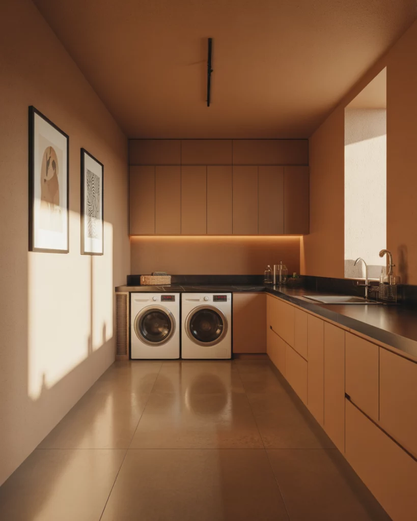 A narrow or small laundry room doesn’t have to feel cramped. Designers in 2026 rely on single-wall layouts, reflective finishes, and slim appliances to maintain circulation while still offering enough storage for daily routines. Common mistakes include oversizing cabinets or choosing bulky machines. Avoiding these errors keeps pathways usable and prevents the room from feeling like a hallway filled with obstacles.