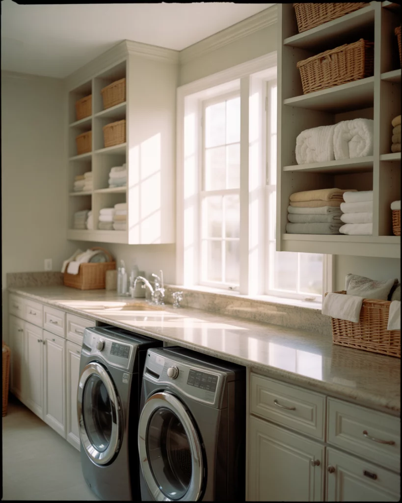 A large laundry room in 2026 often feels closer to a home studio than a utility zone. With generous counters, deep sinks, and layered storage, these rooms are designed for multitasking. The space allows folding, sorting, and even light crafting without feeling crowded or chaotic. Where it works best is in suburban homes or renovations where square footage allows flexibility. Homeowners often use these rooms for more than laundry, which increases daily value and reduces clutter elsewhere.