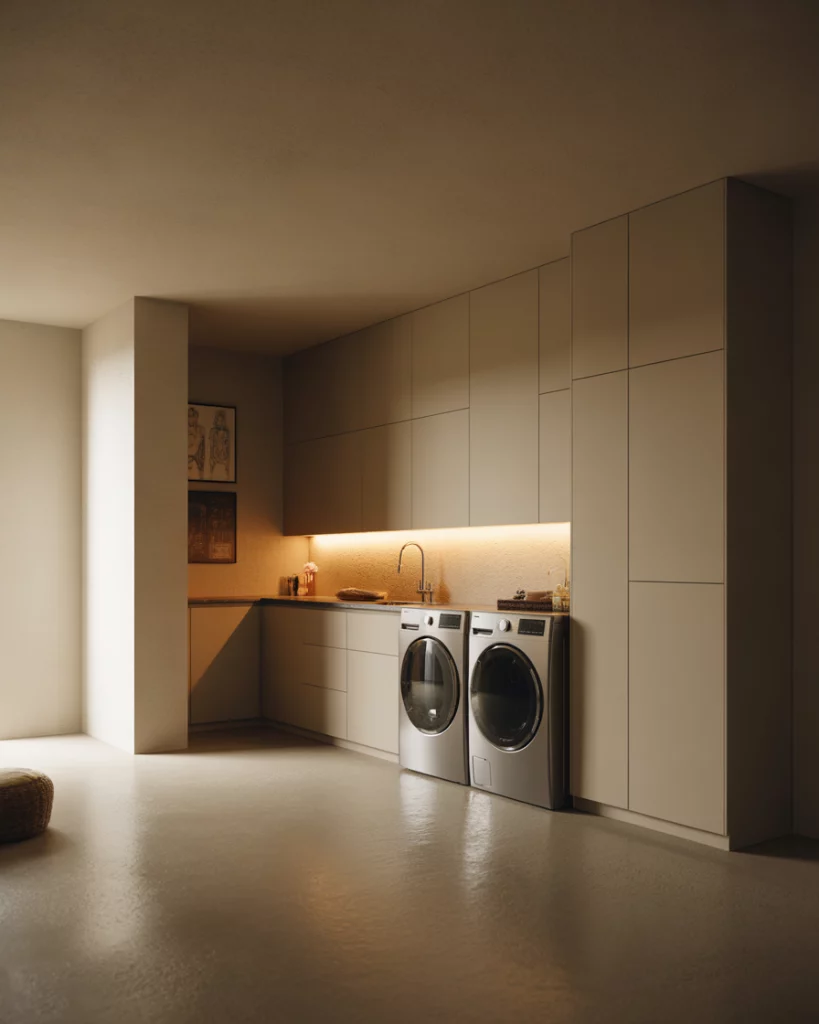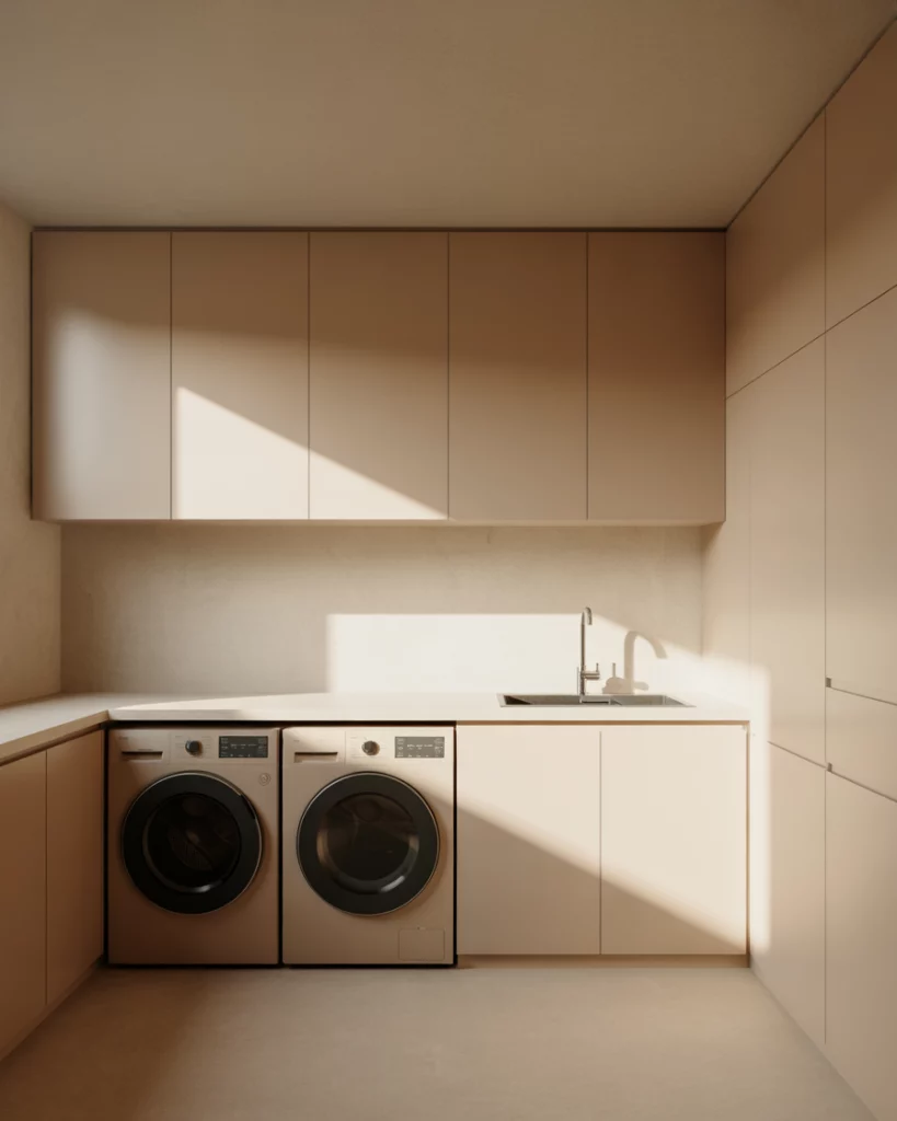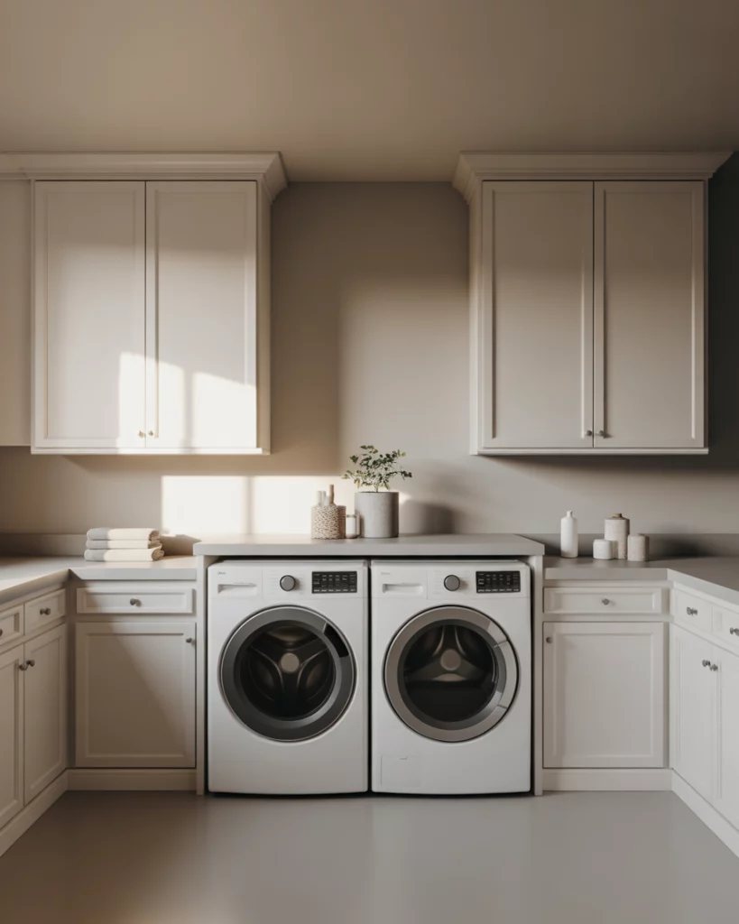 A narrow or small laundry room doesn’t have to feel cramped. Designers in 2026 rely on single-wall layouts, reflective finishes, and slim appliances to maintain circulation while still offering enough storage for daily routines. Common mistakes include oversizing cabinets or choosing bulky machines. Avoiding these errors keeps pathways usable and prevents the room from feeling like a hallway filled with obstacles.