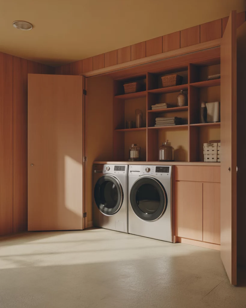 The closet laundry room is gaining popularity in urban apartments and condos. With stacked washer-dryer units hidden behind millwork or sliding panels, these designs allow laundry to live quietly alongside bedrooms or hallways without visual clutter. Real homeowner behavior shows these spaces work best when noise and ventilation are addressed early. Many regret skipping sound-dampening panels, which quickly become essential in close-quarters living.