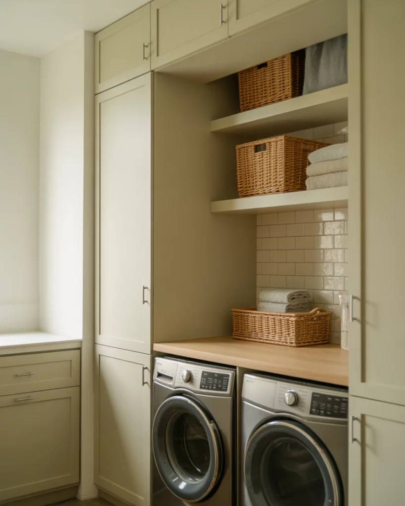 In 2026, a small-space laundry room works hardest when organization is built directly into the design. Shallow cabinets, labeled baskets, and wall-mounted storage turn tight footprints into efficient zones. These rooms feel calm and intentional, even when square footage is limited. Common mistakes include relying on freestanding storage that crowds the room. Built-ins sized to the space prevent clutter creep and make everyday routines smoother without sacrificing visual breathing room.