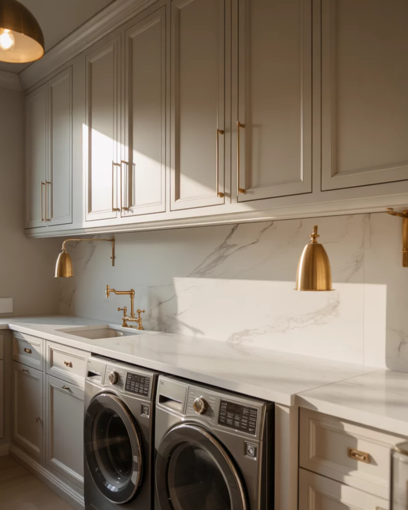 A luxury laundry room in 2026 borrows cues from spas and dressing rooms. Think stone counters, custom cabinetry, integrated sinks, and statement lighting. These rooms often feature a front loader setup that allows for seamless counters and uninterrupted sightlines. Expert-style commentary points out that luxury laundry rooms succeed when beauty doesn’t block workflow. Designers emphasize clear zones for washing, folding, and storage so the space feels indulgent without becoming inefficient.