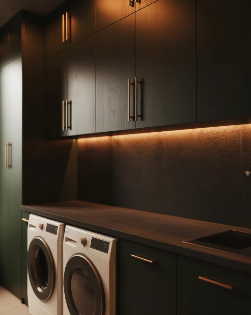 A dark color palette paired with modern finishes creates a bold laundry room that feels intentional. In 2026, these spaces use contrast, matte textures, and controlled lighting to elevate everyday function. Micro anecdotes often mention hesitation before committing to dark colors. Most homeowners report loving the result once balanced lighting is installed.
