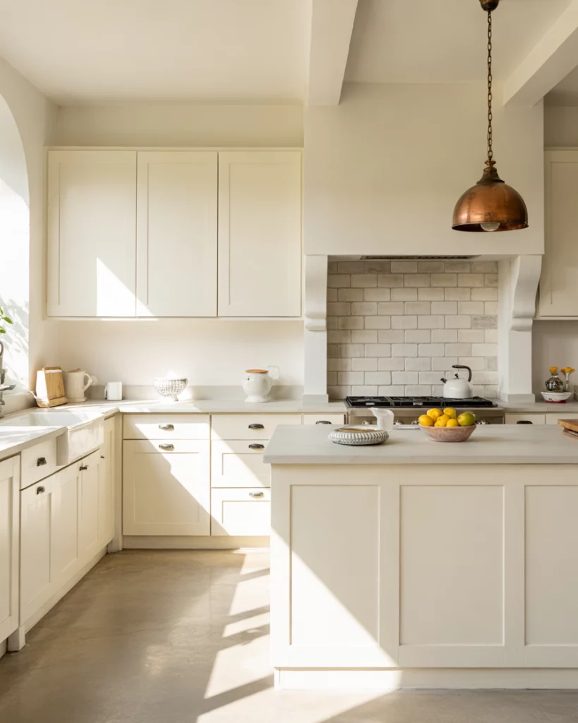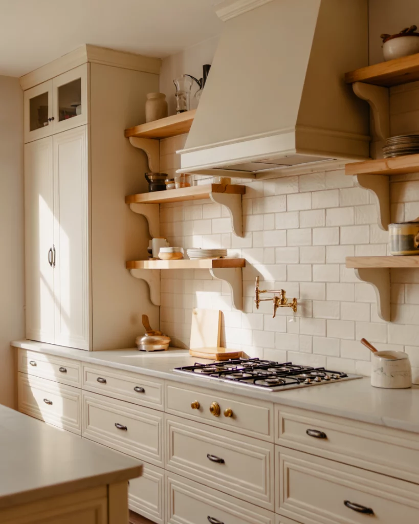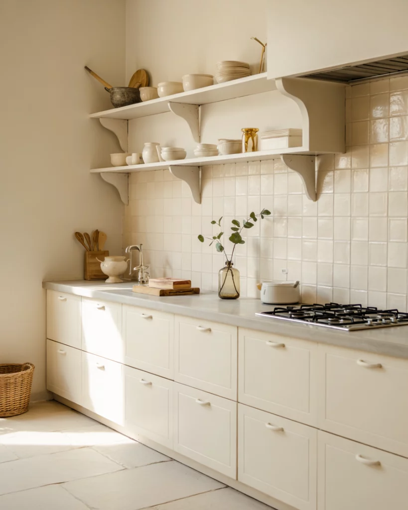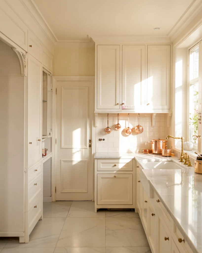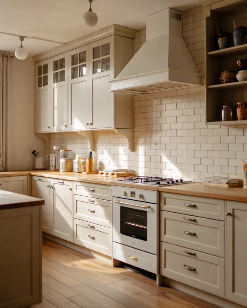 White kitchens gain charm from thoughtful classic trim, from crown molding to paneled all-white fronts. Introducing small touches of cabinet backsplash ideas, tile, or simple decor keeps the space from feeling too formal. The result is timeless, clean, and warmly traditional.