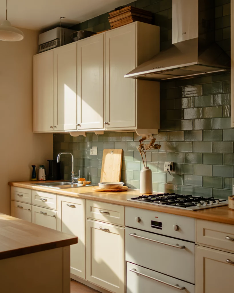 Light green tile ideas help create an airy and cool appearance in your all-white kitchen. In fact, they work quite well when paired with modern cabinetry and an appropriately balanced island. The inclusion of muted wood ideas provides the space with the much-needed elegance.