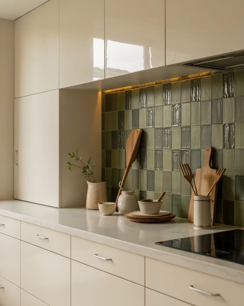When the color green with a moody effect adds an accent in the backsplash of the kitchen, it personalizes the space. Including basic gray and stone keeps the effect fresh and light, allowing the color green in the backsplashed space to remain the focal color.