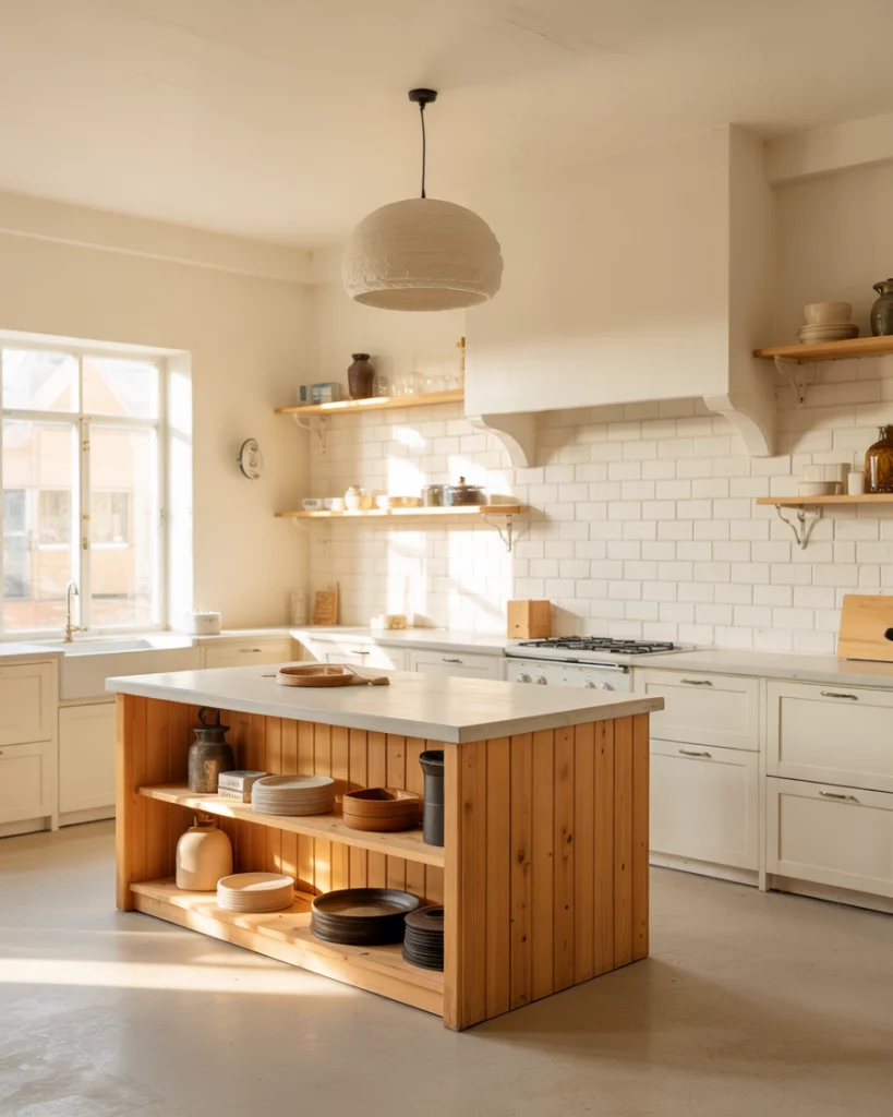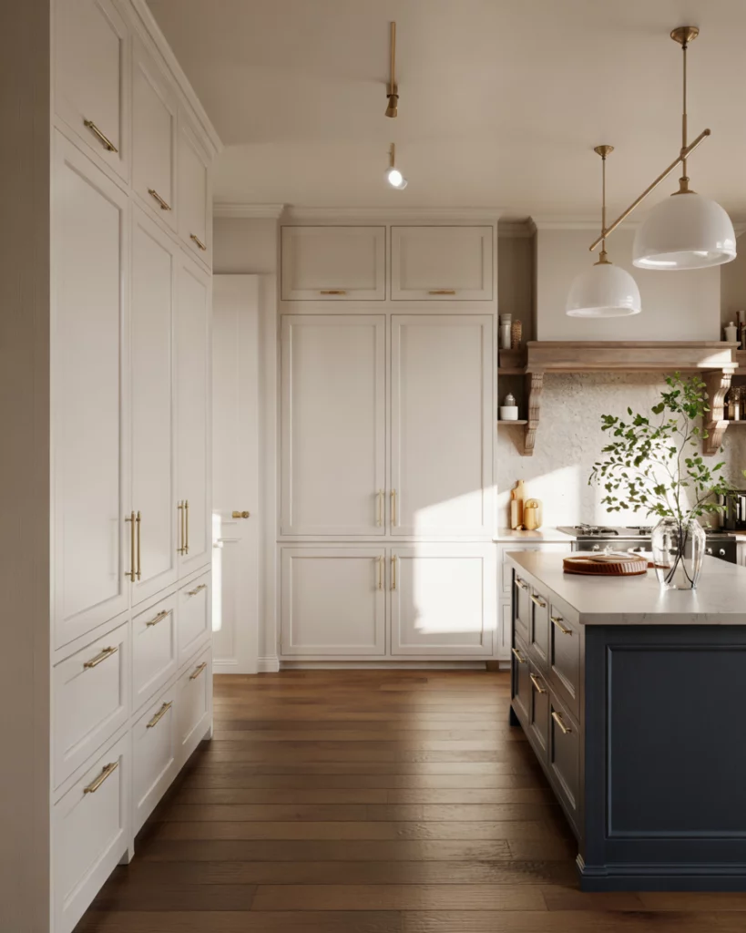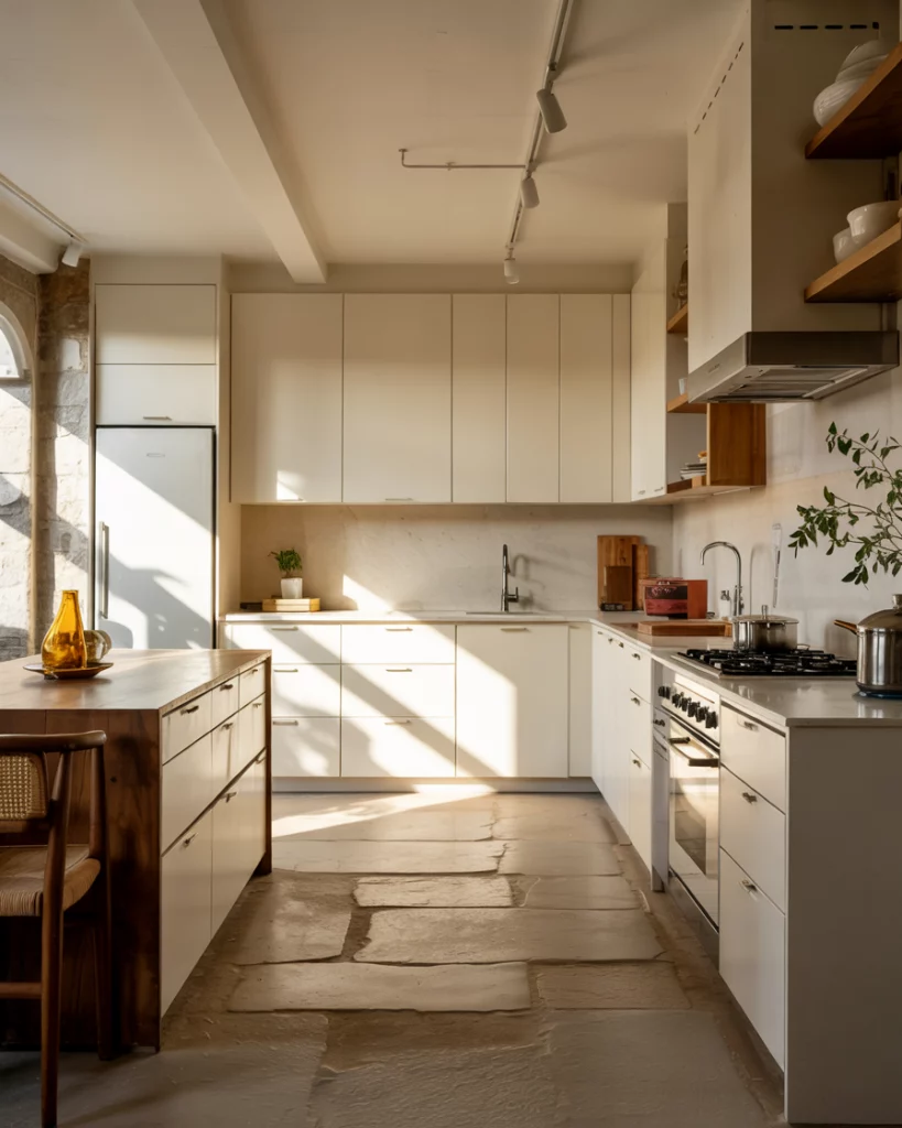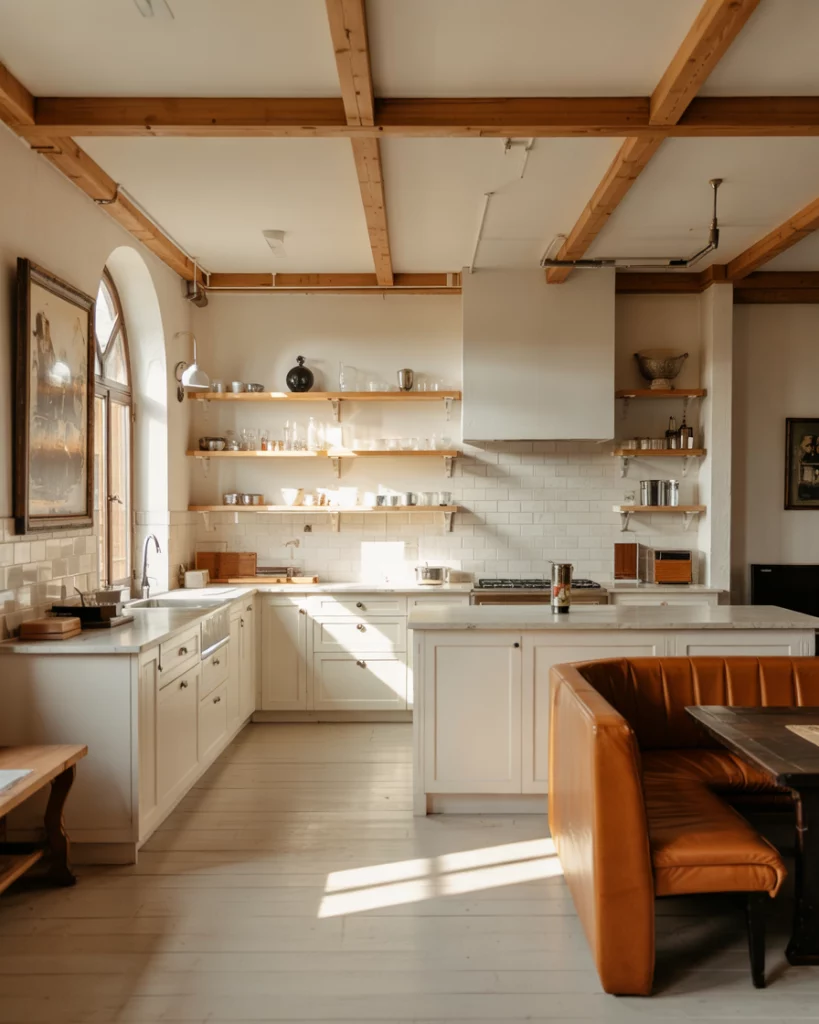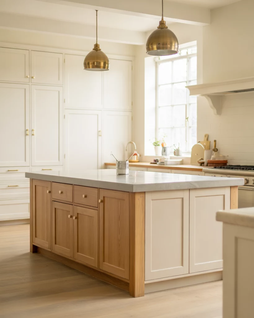 Blending white finishes with a mix of wood and varied tones creates a layered, traveled look. You can combine a pale island base with richer trims or pair light cabinet ideas with deeper accents. Touches of brown and detailing bring warmth without leaning rustic, keeping the space elevated yet informal.