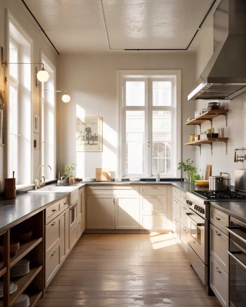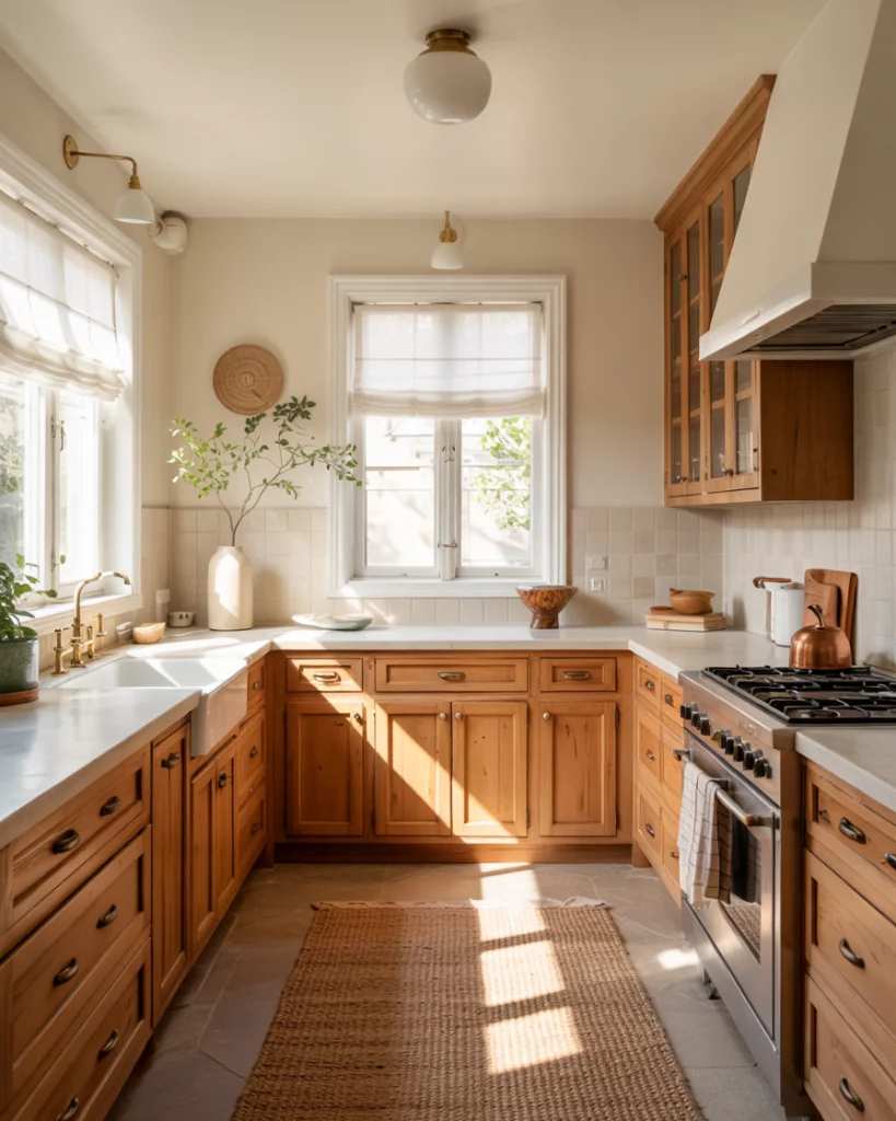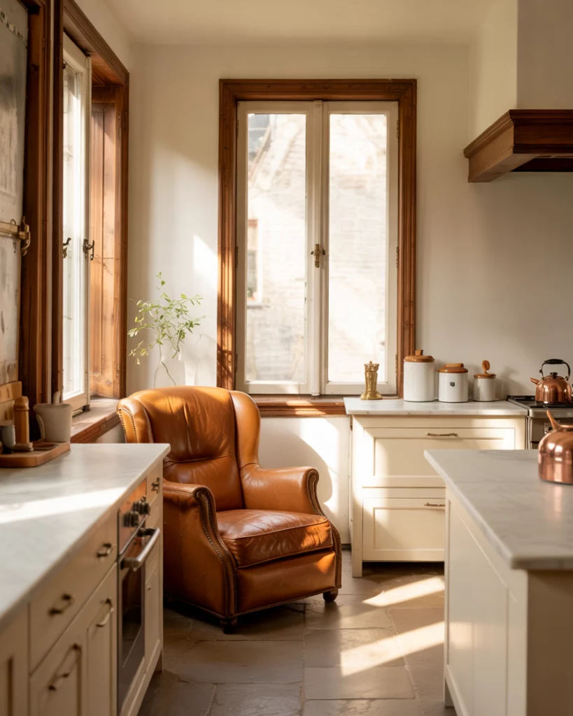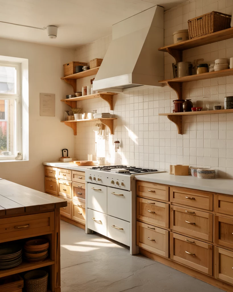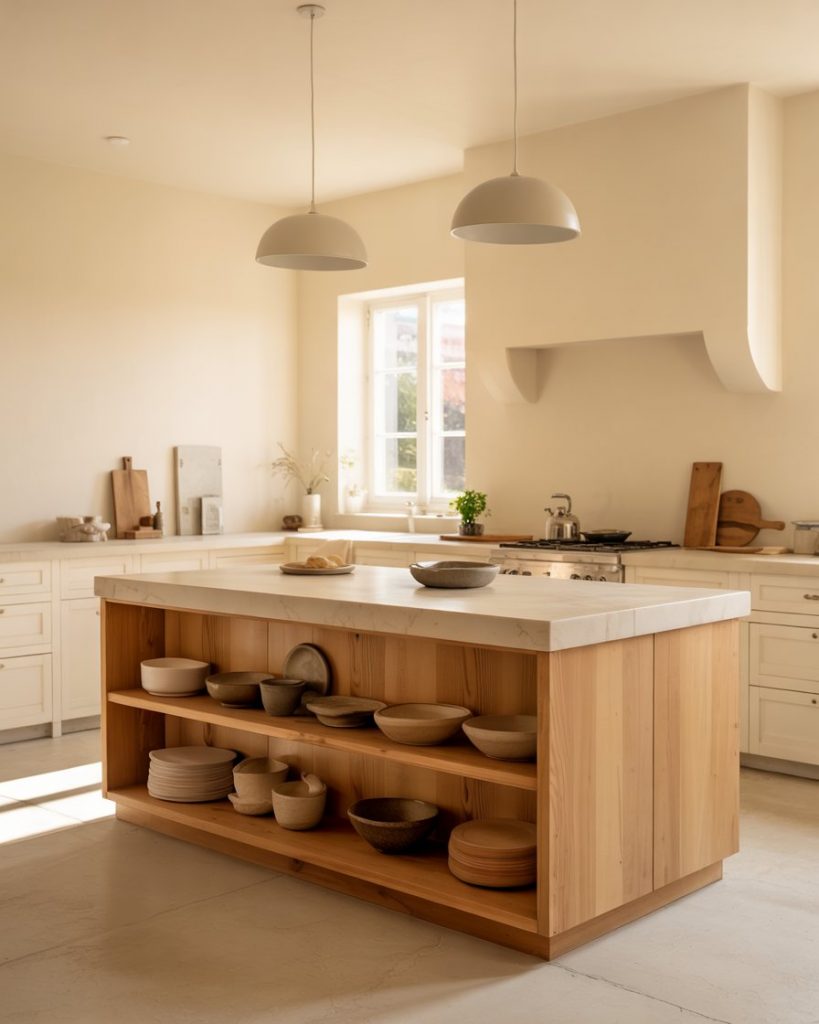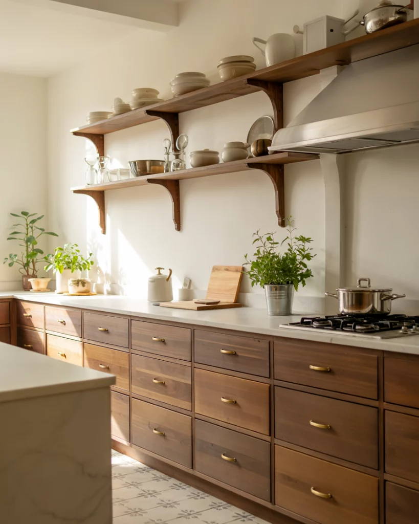 Blending white finishes with a mix of wood and varied tones creates a layered, traveled look. You can combine a pale island base with richer trims or pair light cabinet ideas with deeper accents. Touches of brown and detailing bring warmth without leaning rustic, keeping the space elevated yet informal.