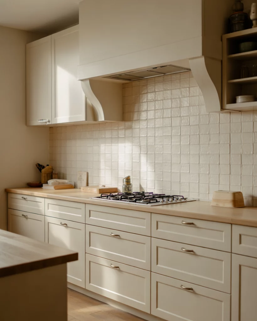 A gentle gray backsplash adds dimension to a white kitchen without stealing the spotlight. It gives the perfect amount of visual depth when combined with light countertops and restrained design elements. Even small kitchens benefit from this quiet tone shift that softens bright cabinetry.