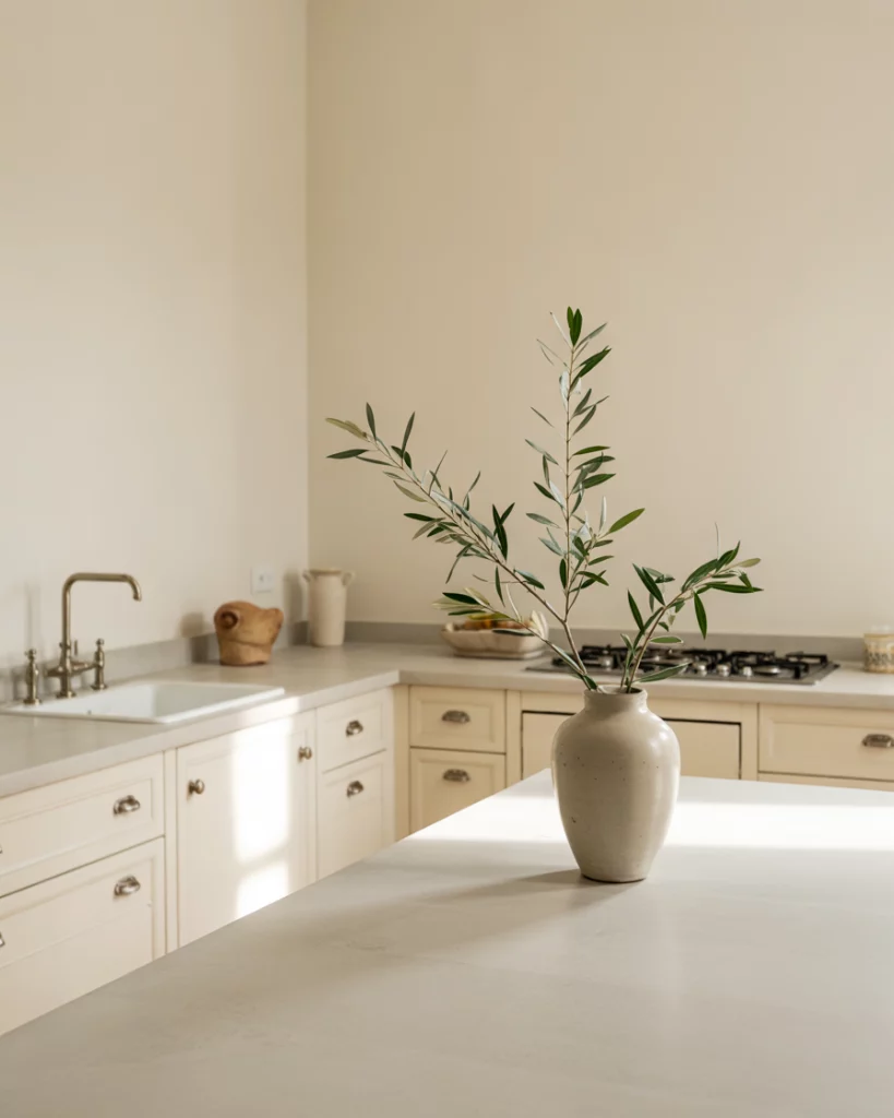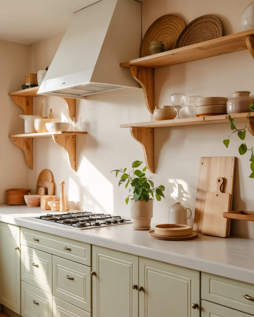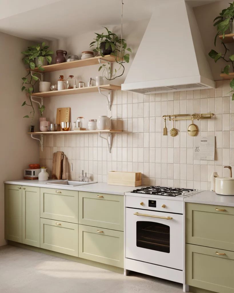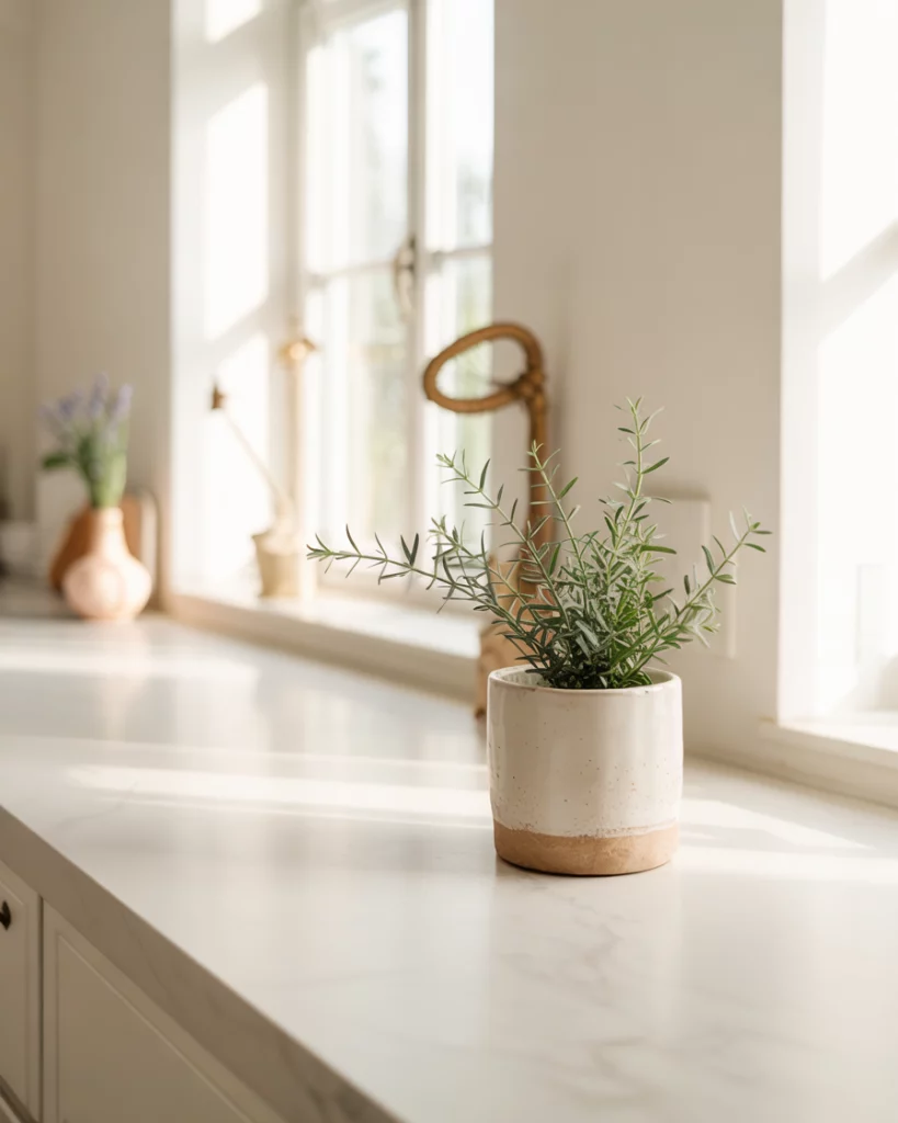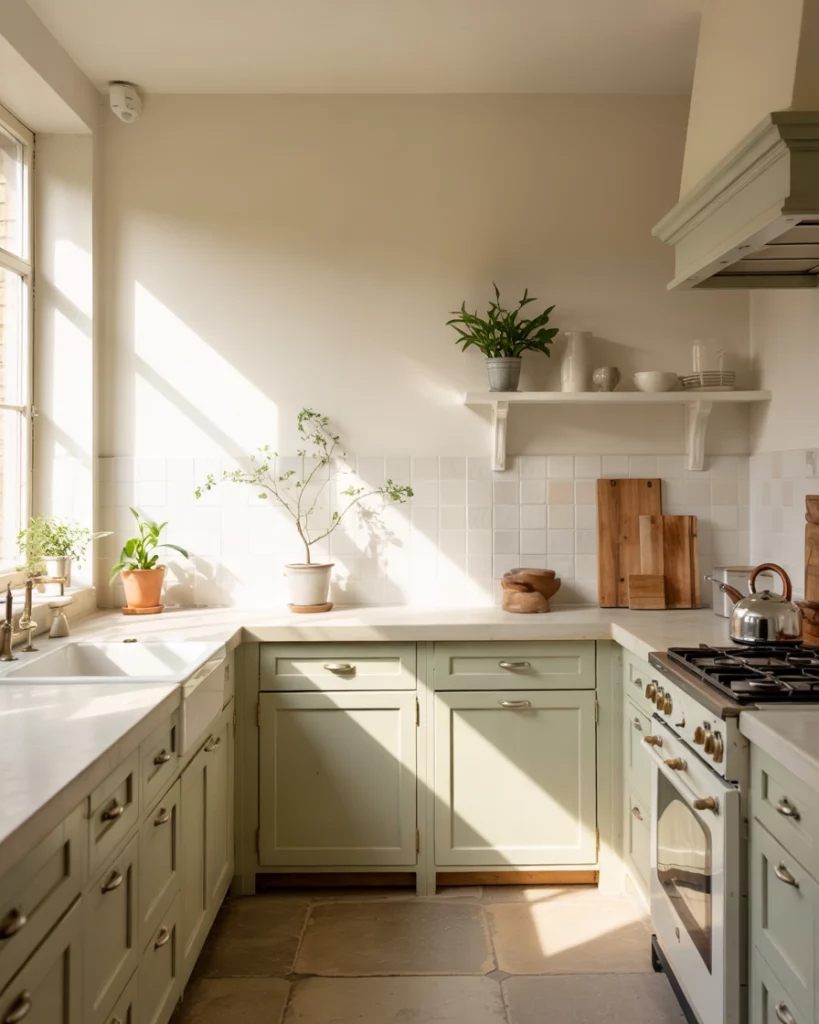 Adding greenery or subtle green décor brings life to a white kitchen instantly. Whether through plants, ceramics, or understated ideas, the color breathes energy into the space. Pairing it with slim cabinet lines keeps the room feeling modern, not botanical.