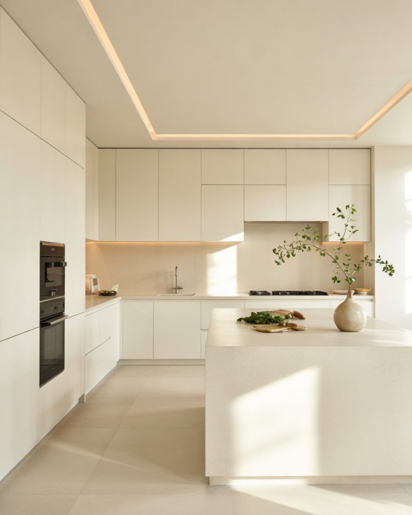 Integrated appliances create a sleek look in white kitchens, allowing the eye to travel seamlessly across cabinets. This approach works especially well with design-forward homes where cohesion matters. Subtle trims and hidden handles keep the vibe modern and quietly upscale.