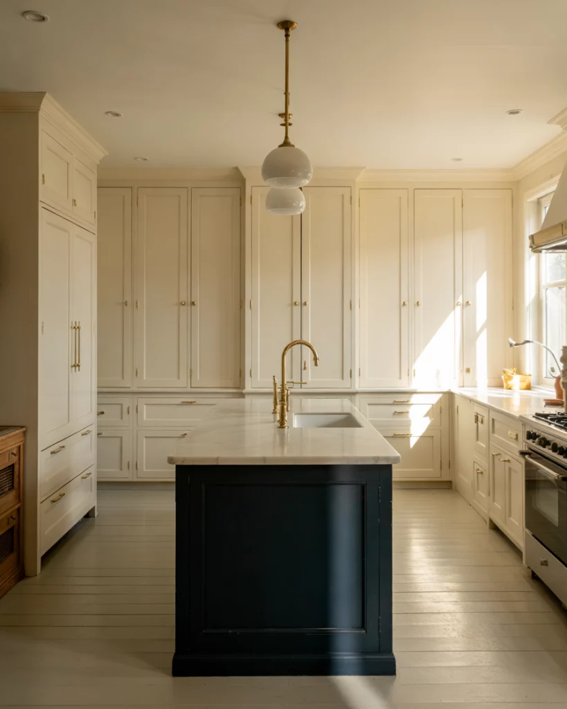 A two-tone island can anchor a white kitchen beautifully. Combining white uppers with a contrasting base—whether brown and muted blue or wood and finishes—adds dimension without crowding the palette. A textured stone top ties everything together.