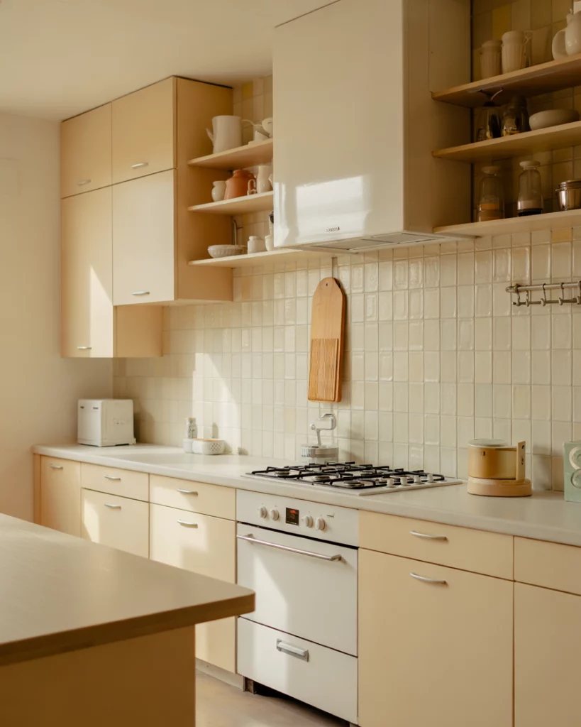 The kitchen, in a white theme and grained oak, accompanied by the elegant oak floating shelves, keeps the space light and airy. Different decorative pieces in the space create the effect and make the space personal. The shelves in the oak and the decorative pieces bring texture and personality to the space.