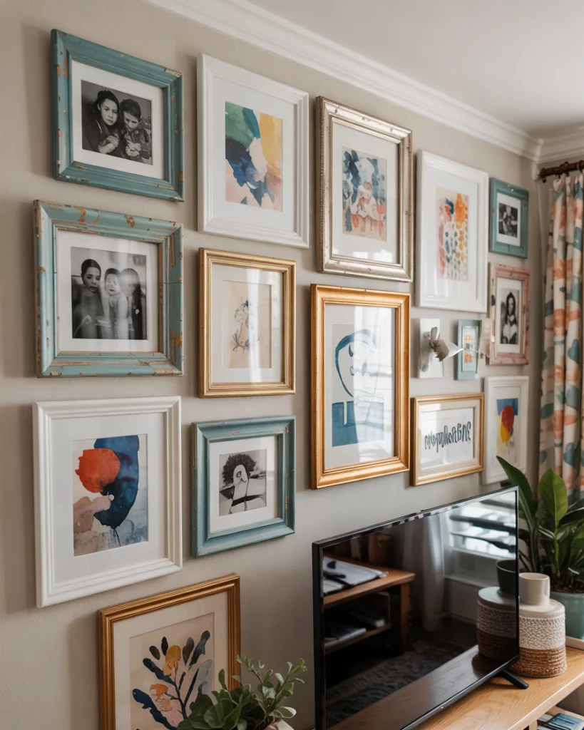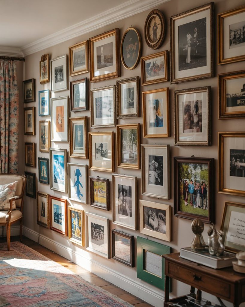 A bedroom gallery wall should feel intimate and soothing. Combine family photos, romantic art, and small mirrors above the bed or dresser for reflection and balance. Add soft lighting or candles to heighten the atmosphere. Mixing thrifted and vintage-inspired frames makes the space uniquely yours—bohemian yet refined, cozy yet deeply inspiring.