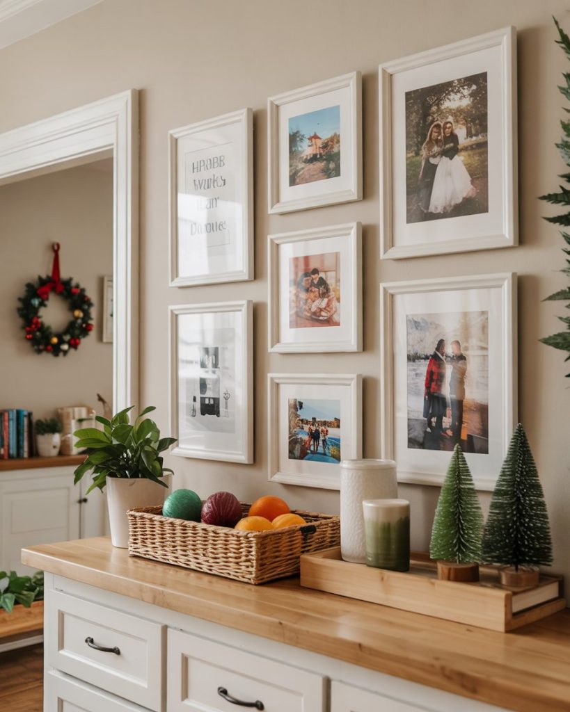 Finally, make your gallery wall dynamic by turning it into a seasonal display: in your kitchen or entryway, have a core set of frames that stay constant but rotate the inserts for Christmas, travel highlights, wedding anniversaries, or spring family gatherings. This keeps the wall fresh and reflects what’s happening in your family life. The concept of art with meaning and personal narrative is strong for 2026 décor.