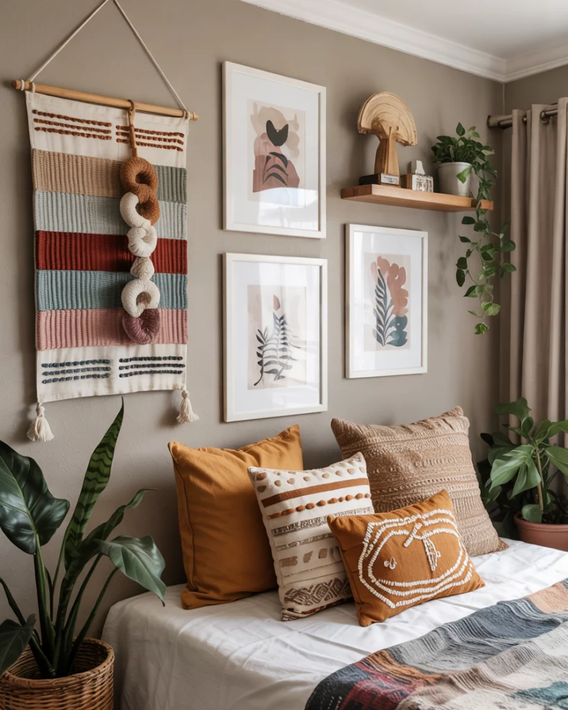 In 2026, the bohemian aesthetic thrives on texture. Blend framed art with woven hangings, small rugs, or fabric panels. Perfect for a bedroom or entryway, it’s warm, relaxed, and deeply personal. Include colorful threads, natural wood shelves, and even handmade ceramic accents. This approach embraces imperfection and creative layering.