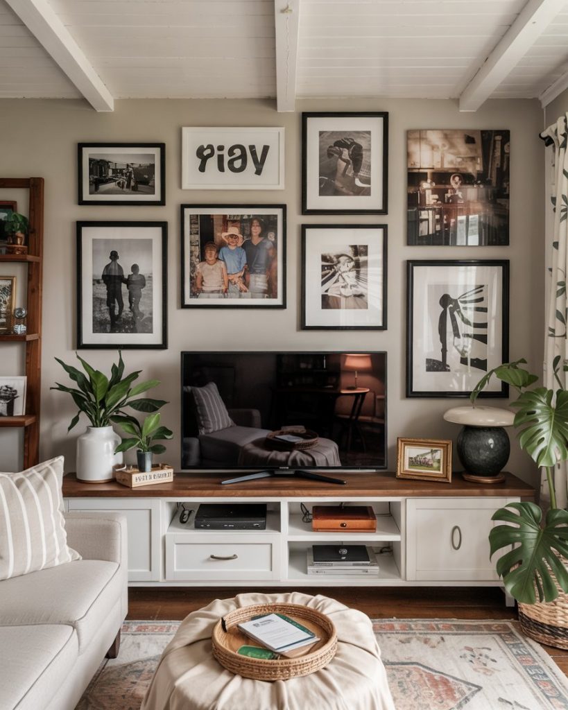 Instead of hiding your TV, frame it—literally! Surround it with family photos, framed travel prints, or vintage-inspired artwork to turn your media wall into something stylish. This setup works best in the living room, helping technology blend with design. Choose frames that echo your furniture’s tone for a seamless finish that feels unique and intentional.