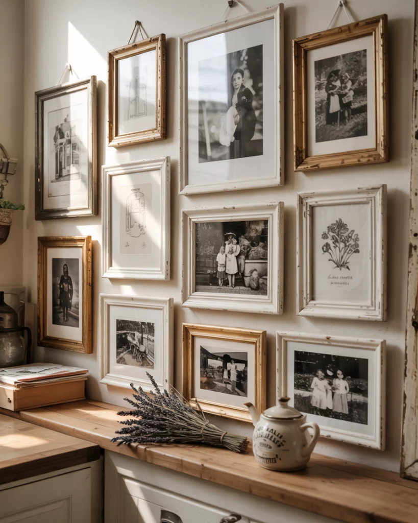 The rustic trend endures through 2026, especially in homes embracing thrifted and handcrafted décor. Think reclaimed wood frames, distressed finishes, and family photos that tell a story. Ideal for living room or kitchen, this idea pairs beautifully with greenery and warm lighting. It’s cozy, timeless, and deeply personal—where imperfection becomes charm.
