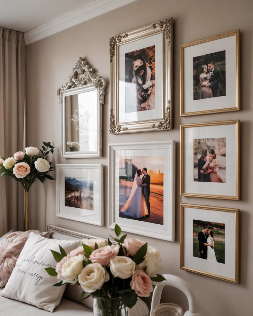 Celebrate your love story with a wedding-themed gallery wall featuring your best wedding photo prints, keepsakes, and elegant typography. Ideal for a bedroom or hallway, it can include the invitation, vows, or floral illustrations in subtle tones. Pairing this with soft lighting makes it an intimate, inspiring feature.