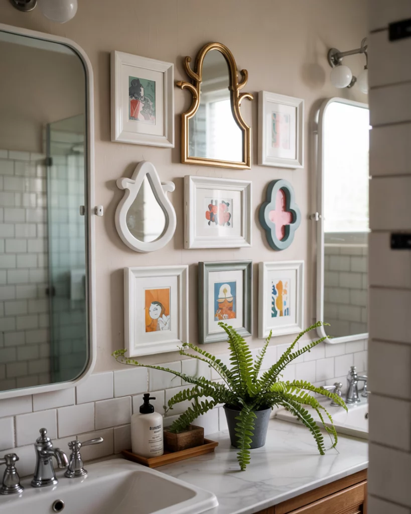 9. Bathroom Gallery Wall with Mirrors & Personal Photos