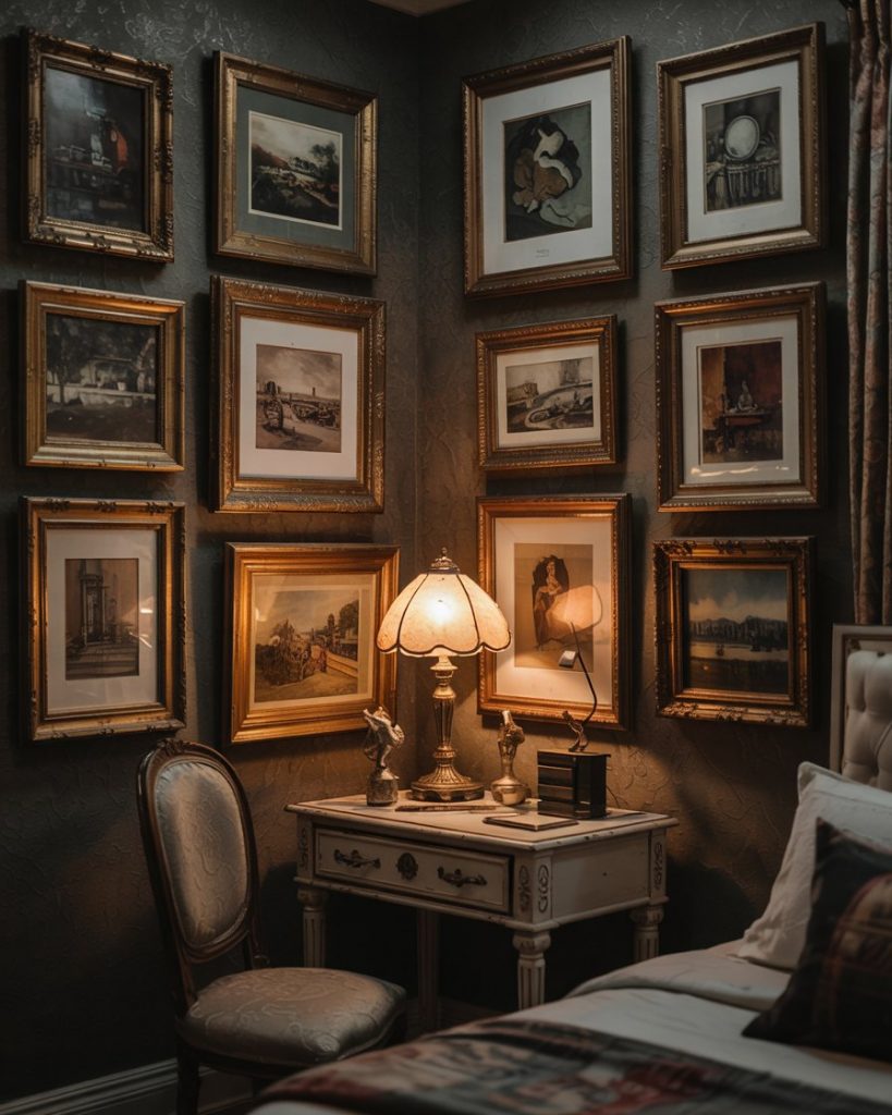 For lovers of dramatic aesthetics, try a gothic corner gallery in your bedroom or entryway. Combine thrifted ornate frames, moody photography, and deep tones—like burgundy and black. Add a candle sconce or brass detail for contrast. It’s mysterious yet refined, evoking romantic old-world charm in modern homes.