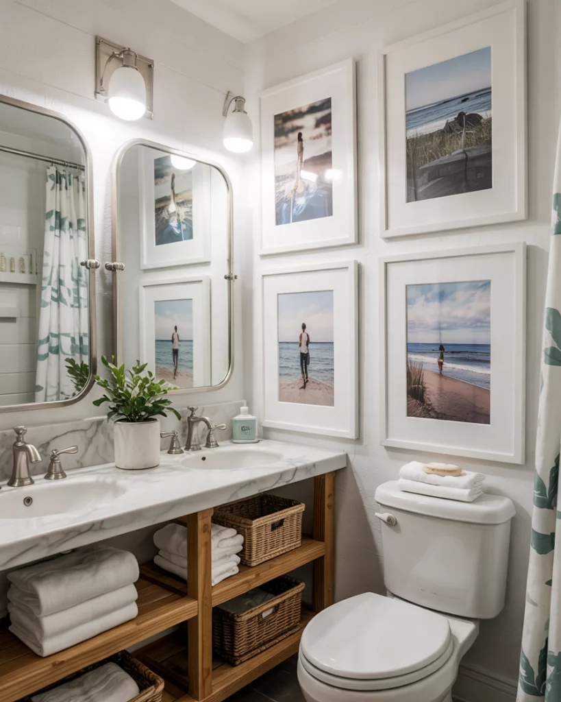 Create a light and airy coastal gallery wall in your bathroom using nautical prints, beach photo art, and small mirrors for reflection. White frames, rope details, and sea-glass hues make the space tranquil and bright. It’s perfect for seaside lovers and brings the serenity of ocean air indoors.
