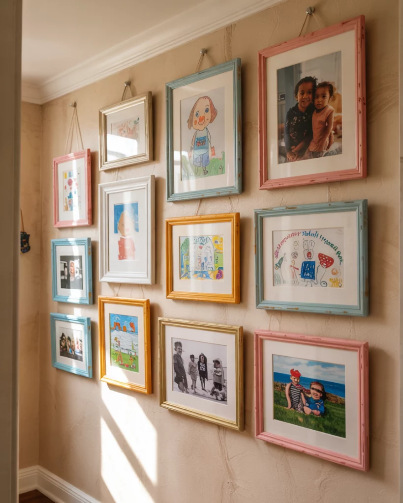 Turn your hallway into an evolving exhibit by framing your children’s artwork alongside family photos and colorful doodles. Use bright mats or thrifted frames to keep it fun and personal. This DIY wall makes your kids feel proud and adds a touch of whimsy to your home. It’s a charming conversation starter for guests and a sweet reminder of growing creativity within your family.