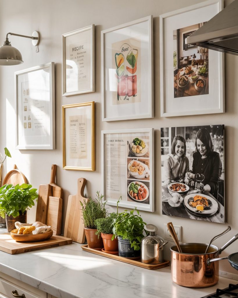 Bring life to your kitchen with a modern gallery wall featuring recipe art, vintage food illustrations, and framed photo prints from memorable family dinners or Christmas gatherings. Mixing vintage-inspired and minimalist pieces adds warmth and charm, while keeping the look balanced. It’s practical décor that feeds the eye and the heart—a perfect blend of function and nostalgia.