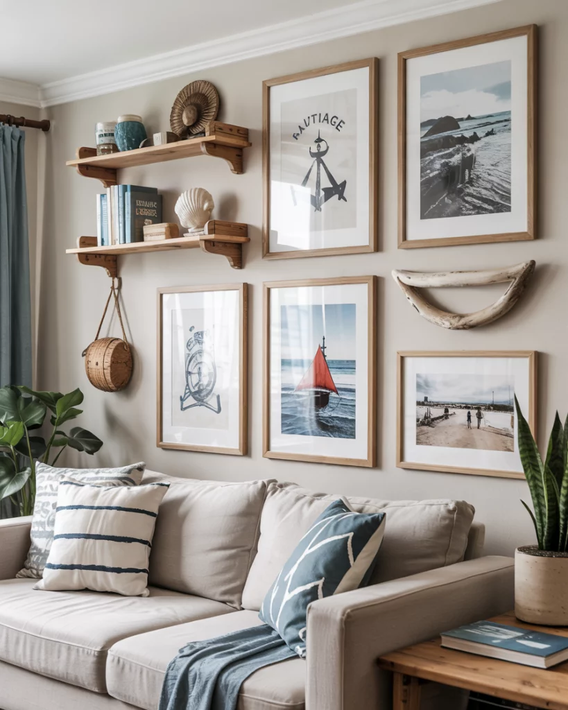 Bring the relaxed vibe of the shore into a bedroom or living room with a gallery wall centered around your favourite travel beach shots, nautical prints and shell or driftwood accents. Think whitewashed frames, soft blues and sandy neutrals. This coastal twist gives your home a tranquil, yet personal feel. In 2026, nature-inspired prints and meaningful art are trending, making this idea both stylish and heartfelt.