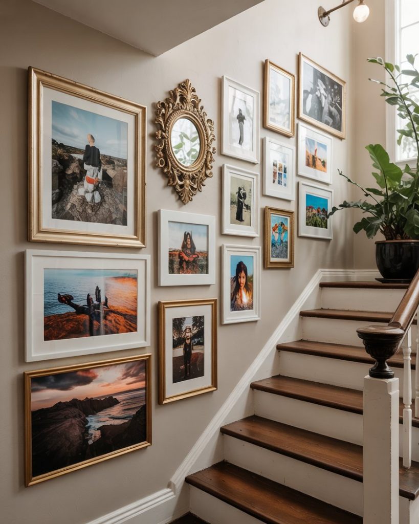 Staircases provide a perfect vertical canvas for a cascading gallery wall. Use your favourite travel snapshots, family photos, framed wedding photo, and souvenirs arranged along the stairs wall. The upward flow symbolizes both movement and memory. This approach turns what might be a transitional space into a gallery you pass through daily, making it both functional and inspiring. Trend commentary notes that gallery walls are reclaiming feature-space in homes as storytelling tools.