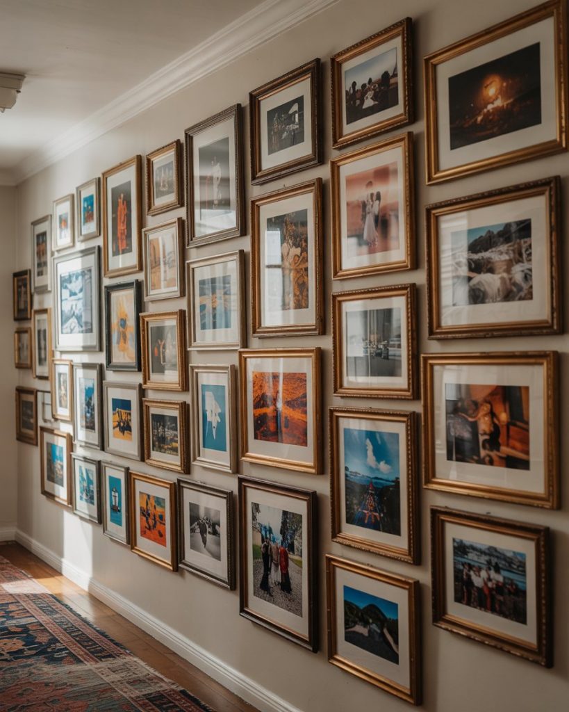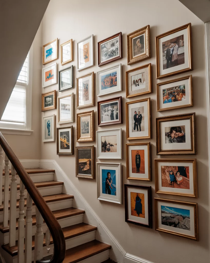 Staircases provide a perfect vertical canvas for a cascading gallery wall. Use your favourite travel snapshots, family photos, framed wedding photo, and souvenirs arranged along the stairs wall. The upward flow symbolizes both movement and memory. This approach turns what might be a transitional space into a gallery you pass through daily, making it both functional and inspiring. Trend commentary notes that gallery walls are reclaiming feature-space in homes as storytelling tools.