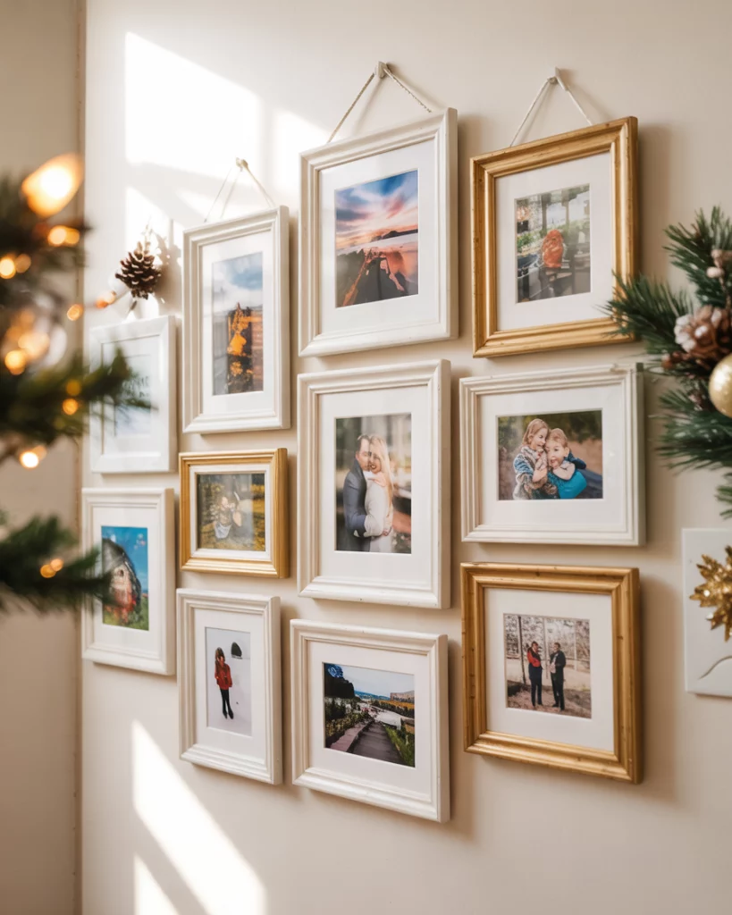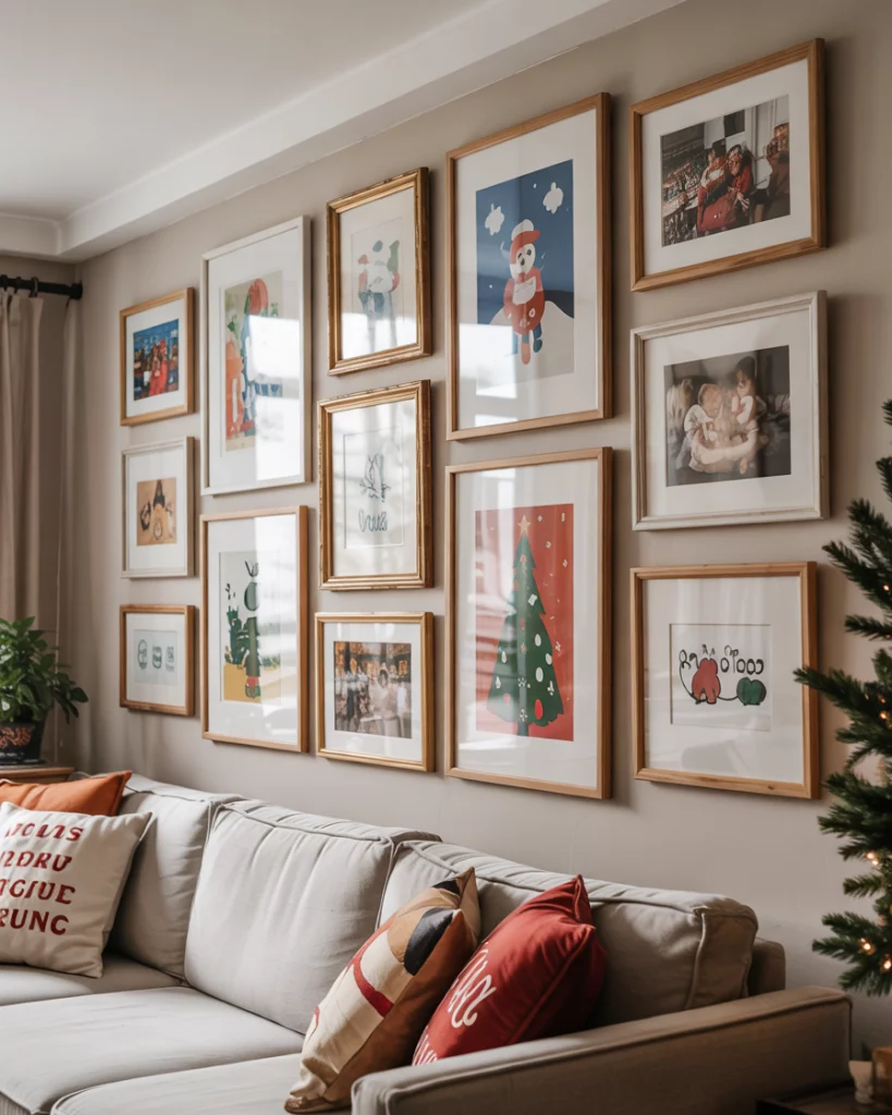 Finally, make your gallery wall dynamic by turning it into a seasonal display: in your kitchen or entryway, have a core set of frames that stay constant but rotate the inserts for Christmas, travel highlights, wedding anniversaries, or spring family gatherings. This keeps the wall fresh and reflects what’s happening in your family life. The concept of art with meaning and personal narrative is strong for 2026 décor.