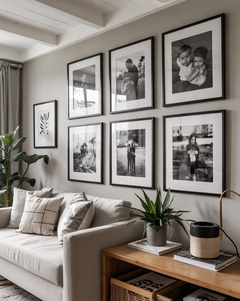 If you prefer order and symmetry, the monochrome modern grid is your match. A clean arrangement of evenly spaced picture frames—often in black, white, or wood tones—creates harmony and balance. Ideal for living room or hallway spaces, this design highlights structure while keeping focus on your family photos or minimalist prints. The uniformity feels calm and curated, perfect for contemporary interiors.