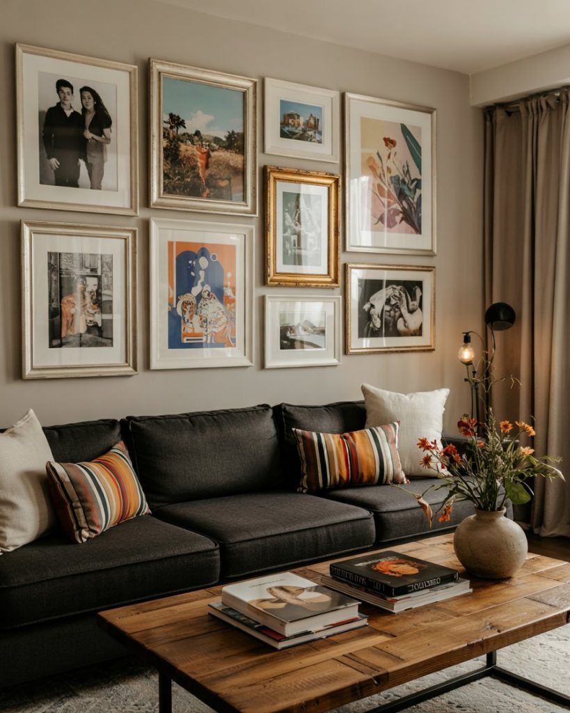 Keep your décor fresh year-round with a creative rotating wall for living room. Swap out art and family photos each season—maybe Christmas scenes in winter, travel prints in summer. Use easy-access frames or clipboards for quick changes. It’s interactive, engaging, and never boring—a trend gaining traction in 2026.