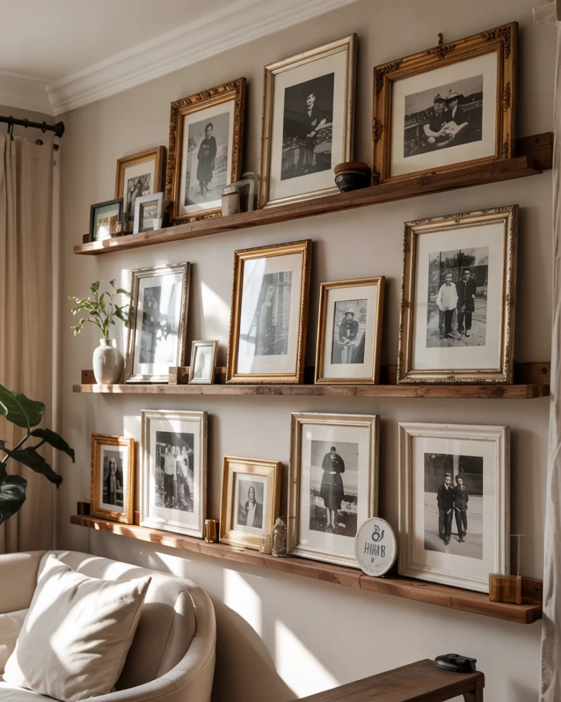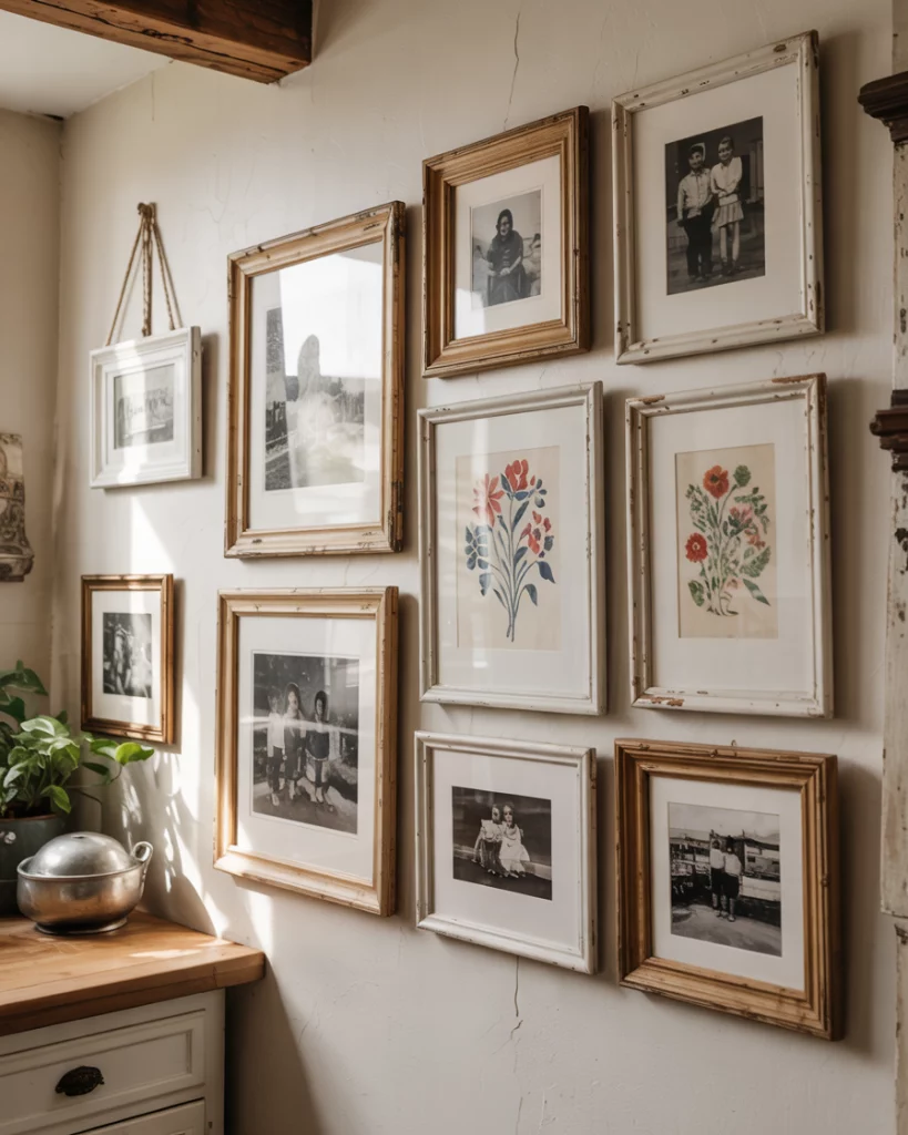 The rustic trend endures through 2026, especially in homes embracing thrifted and handcrafted décor. Think reclaimed wood frames, distressed finishes, and family photos that tell a story. Ideal for living room or kitchen, this idea pairs beautifully with greenery and warm lighting. It’s cozy, timeless, and deeply personal—where imperfection becomes charm.