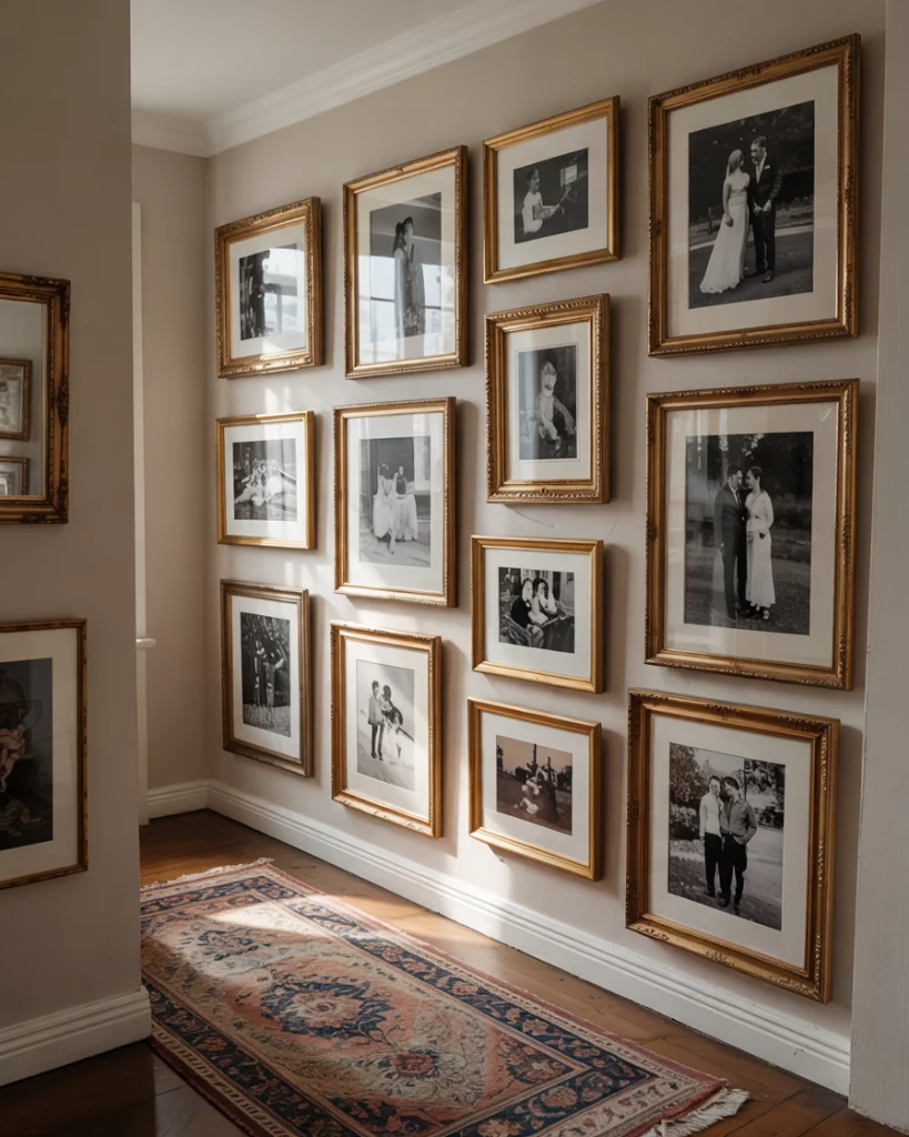 Celebrate your love story with a wedding-themed gallery wall featuring your best wedding photo prints, keepsakes, and elegant typography. Ideal for a bedroom or hallway, it can include the invitation, vows, or floral illustrations in subtle tones. Pairing this with soft lighting makes it an intimate, inspiring feature.