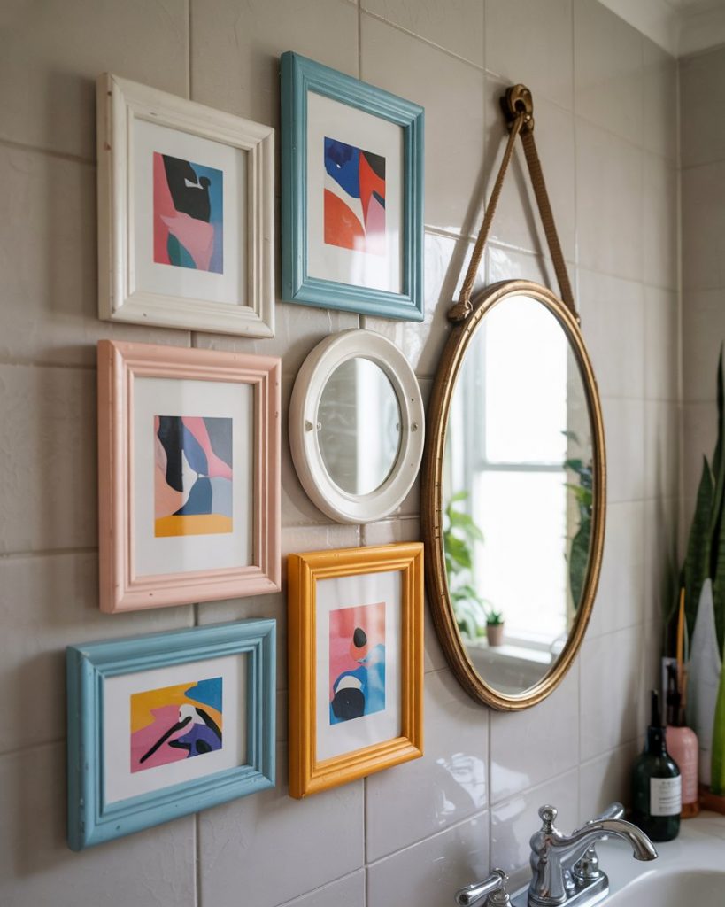Even small spaces deserve beauty. A bathroom gallery wall adds personality—mix colorful, small picture frames with mirrors or typography prints. Keep it balanced yet unique by playing with layout and proportion. Ideal above a towel rack or vanity, it proves that art has no room restrictions in 2026 design thinking.