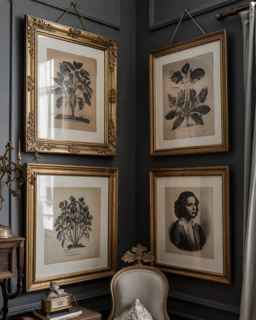 For lovers of dramatic aesthetics, try a gothic corner gallery in your bedroom or entryway. Combine thrifted ornate frames, moody photography, and deep tones—like burgundy and black. Add a candle sconce or brass detail for contrast. It’s mysterious yet refined, evoking romantic old-world charm in modern homes.