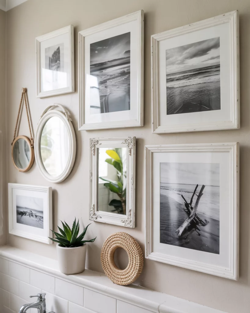 Create a light and airy coastal gallery wall in your bathroom using nautical prints, beach photo art, and small mirrors for reflection. White frames, rope details, and sea-glass hues make the space tranquil and bright. It’s perfect for seaside lovers and brings the serenity of ocean air indoors.