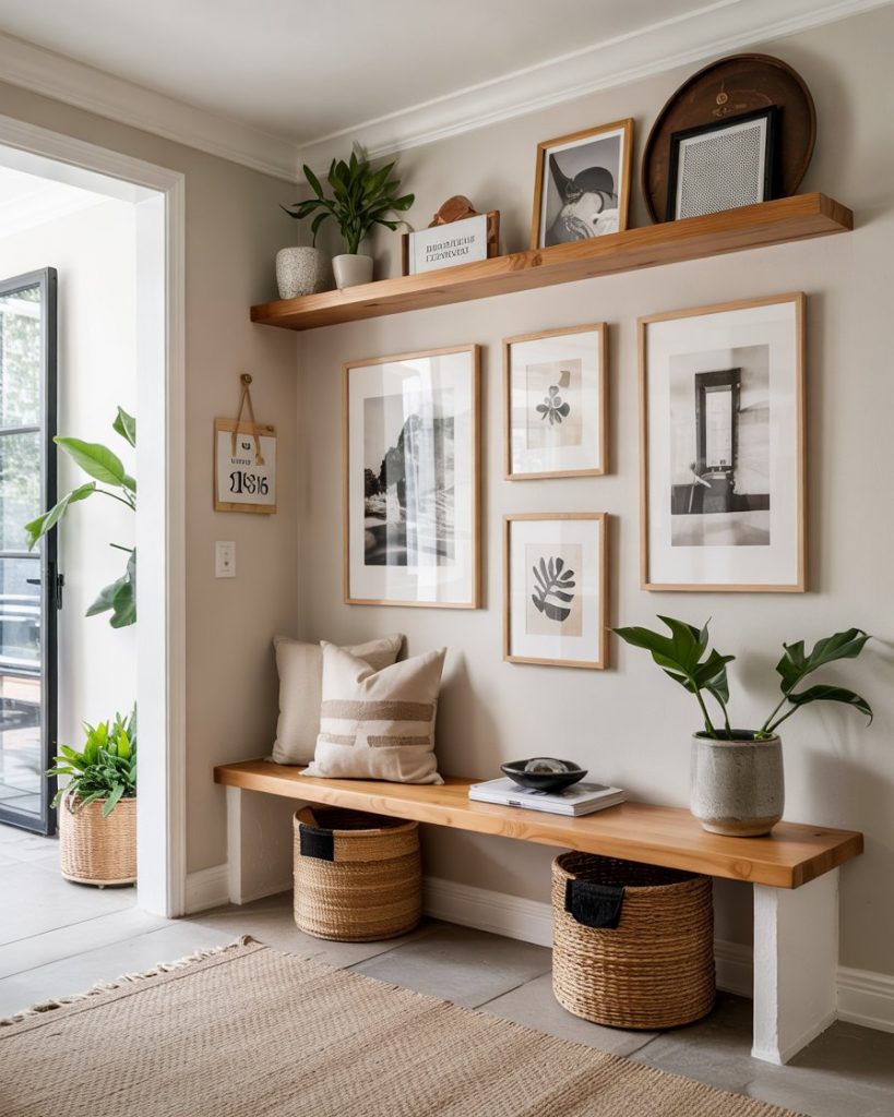Make your entryway unforgettable with a single line of floating shelves holding curated prints and photo frames. Choose neutral tones and clean compositions. It’s understated yet impactful—an easy way to make a small space feel designed. This minimalist gallery is both modern and inviting, setting the mood for the home beyond.