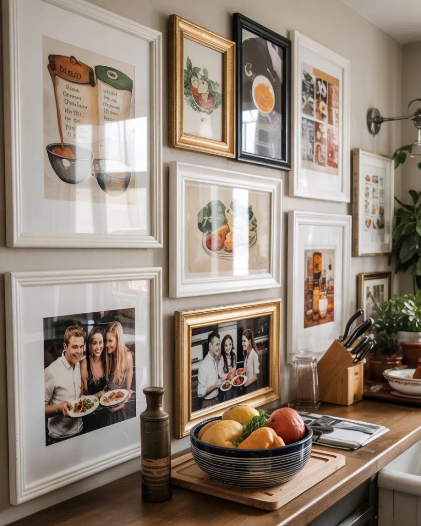 Bring life to your kitchen with a modern gallery wall featuring recipe art, vintage food illustrations, and framed photo prints from memorable family dinners or Christmas gatherings. Mixing vintage-inspired and minimalist pieces adds warmth and charm, while keeping the look balanced. It’s practical décor that feeds the eye and the heart—a perfect blend of function and nostalgia.