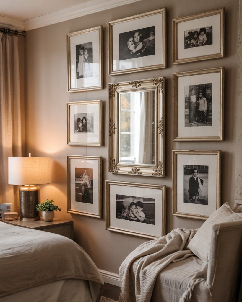 23. Cozy Bedroom Gallery with Mirrors and Family Photos