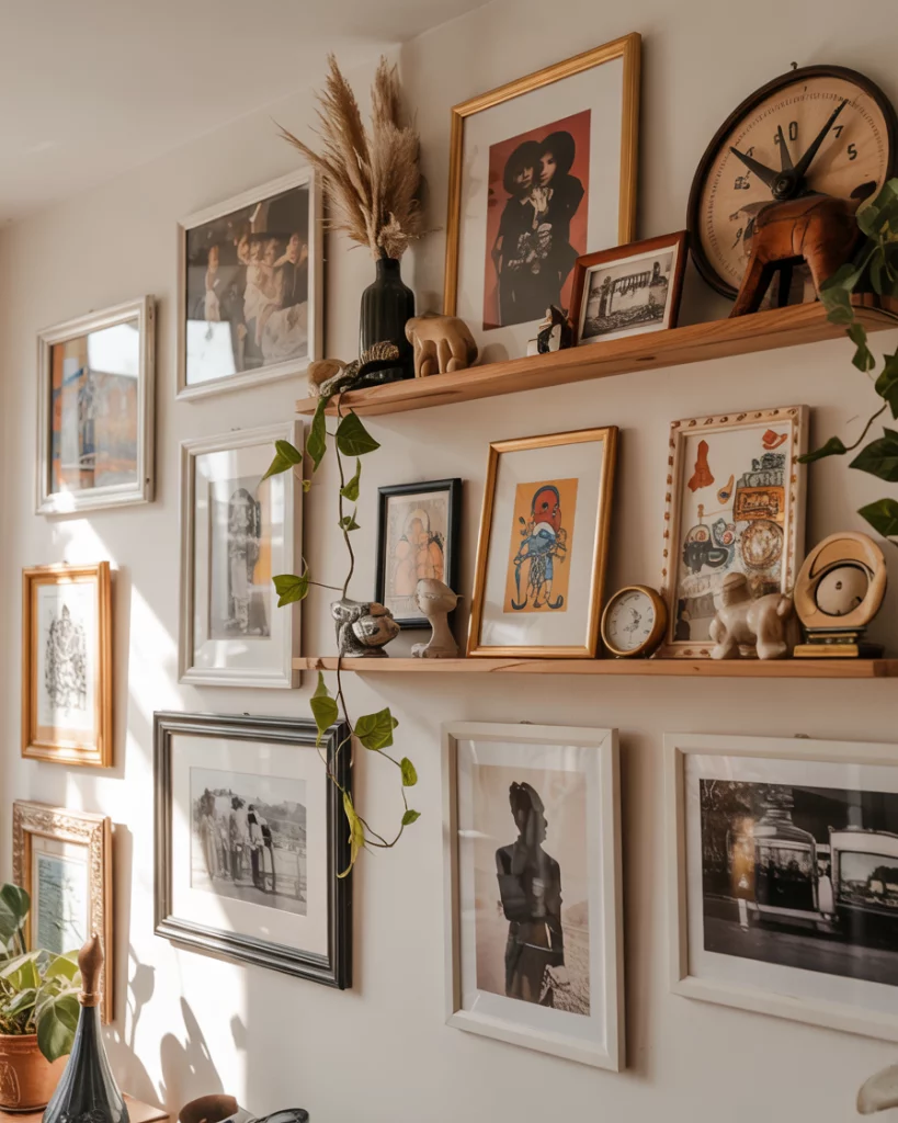 If your interior leans toward bohemian, bring that free-spirited energy to a gallery wall mounted on shelves rather than directly on the wall. Use floating picture shelves to layer framed art, family photos, travel souvenirs and boho finds. Spice it up with colorful frames, bold matting, and even small artifacts or macramé pieces. This style adds texture and movement, perfect for a bedroom or creative studio wall. The layering and informal layouts reflect the trend of more relaxed, character-rich wall compositions.