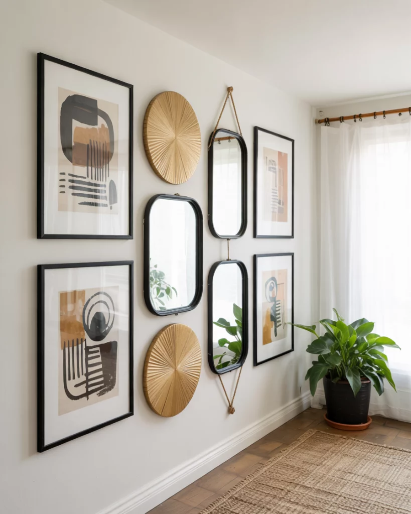 For a sleek, modern take in your entryway or living room, combine framed art or picture prints with decorative mirrors. Use a consistent frame colour, such as matte black, and include one or two round mirrors to break the grid. Adding mirrors brings light and depth to a space, ideal for smaller rooms. Mixing functional mirrors with art creates an elegant, intentional display—perfect if your décor is clean but you still want personality. Interiors in 2026 emphasise texture, natural materials and purposeful styling.