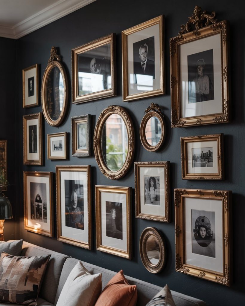 A bedroom gallery wall should feel intimate and soothing. Combine family photos, romantic art, and small mirrors above the bed or dresser for reflection and balance. Add soft lighting or candles to heighten the atmosphere. Mixing thrifted and vintage-inspired frames makes the space uniquely yours—bohemian yet refined, cozy yet deeply inspiring.