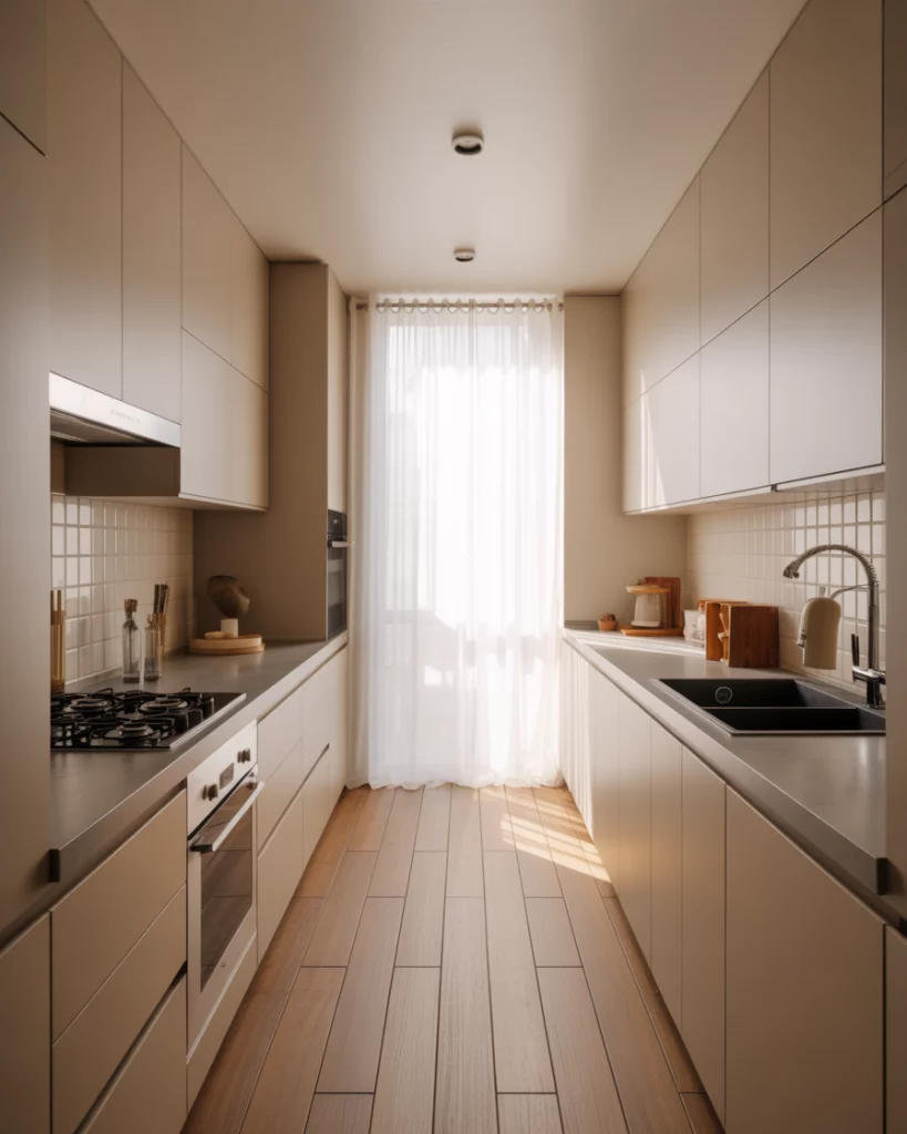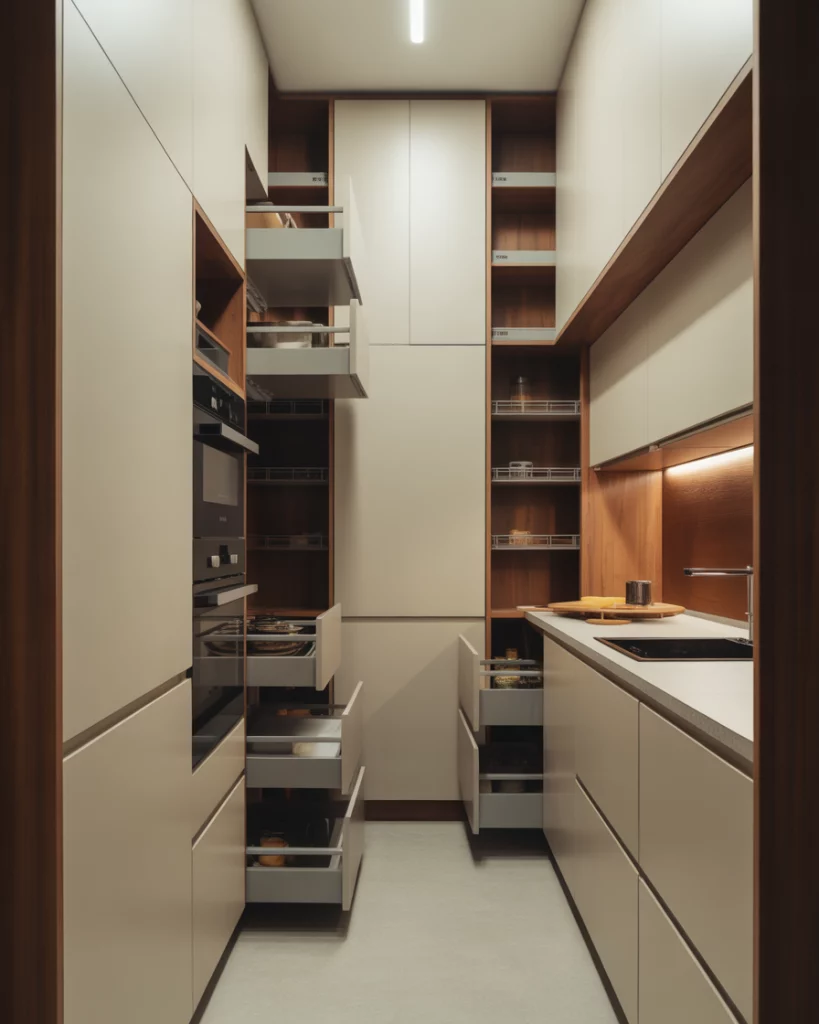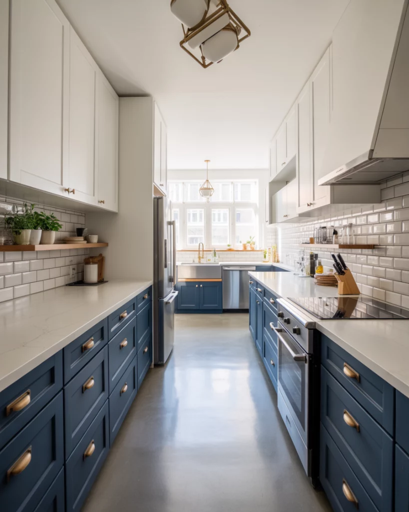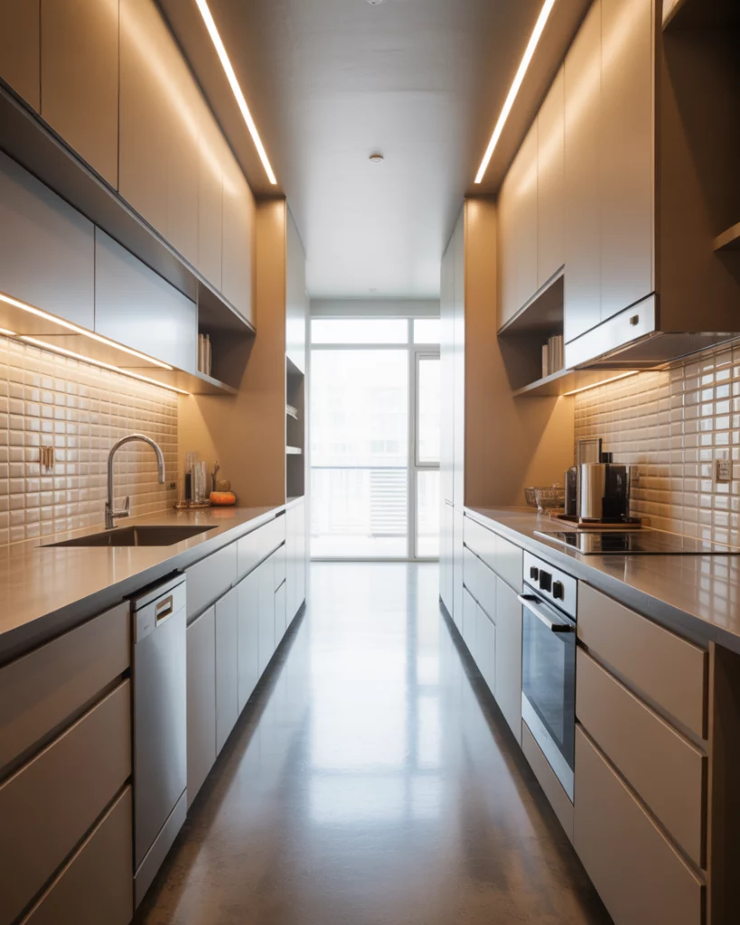 A double galley setup—cabinets on both sides—creates efficient zones for prep, cooking, and cleanup. Thoughtfully planned cabinets keep essentials accessible, ideal for compact cooking enthusiasts. This structure works well in condos or accessory dwelling units where maximizing space matters. I once tested this layout in my own rental and managed to store everything from mixers to meal-prep containers with ease.